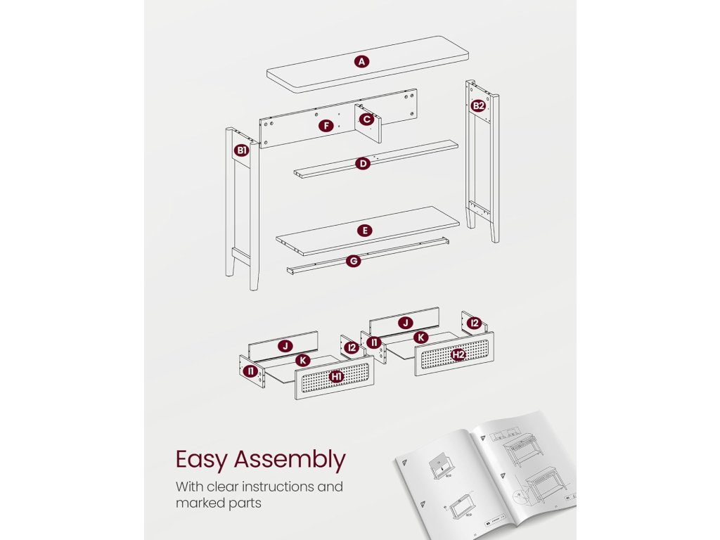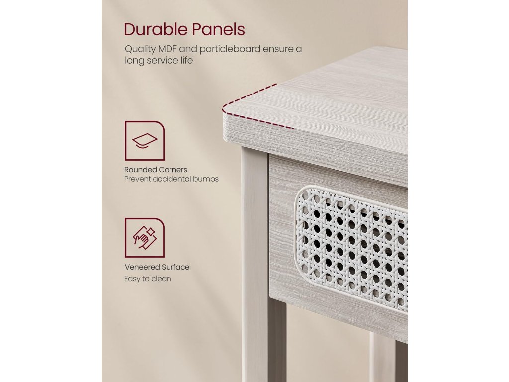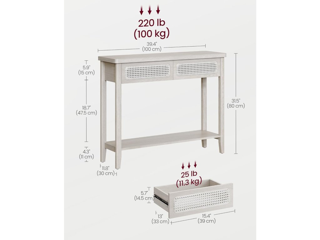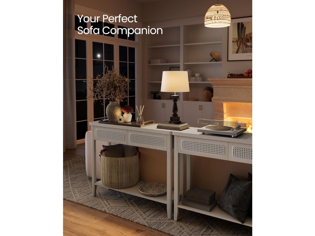 Invite Boho Charm In Tento konzolový stolek vyzařuje bohémský půvab díky béžovému odstínu, který souzní s přírodními prvky, a přední části zásuvky z PVC ratanu, která dodává další vrstvu textury. Skvěle se hodí k vylepšení moderního prostoru nebo k obohacení boho interiéru.Robustní konstrukce Prvotřídní MDF v kombinaci s vysoce kvalitní dřevotřískovou deskou a odolným plastovým ratanem tvoří robustní rozkládací stůl, který pohodlně unese až 220 kg. Můžete na něj s klidem položit knihy, lampy, rostliny v květináčích nebo fotorámečky!.Dostatek úložného prostoru S tímto úzkým stolkem do vstupní haly si udržíte organizovaný prostor. Má velkou desku na odkládání často používaných předmětů nebo vystavování dekorací, 2 velké zásuvky na odkládání soukromých věcí a otevřenou polici na boty nebo úložné koše.Snadná údržba a montáž Díky hladkému dýhovanému povrchu MDF, který je odolný vůči vodě, je čištění hračka, stačí jej otřít vlhkým hadříkem. Montáž je bezproblémová díky jasnému návodu a označeným dílům.Všestranný univerzál Ať už tento stolek umístíte do ložnice, obývacího pokoje, vstupní haly, pracovny, jídelny nebo třeba ke schodišti. dokonale zapadá do interiéru a zároveň nabízí elegantní podstavec pro vystavení rámečků na obrazy, váz nebo dekorací.| Kategorie: | Konferenční stolky |