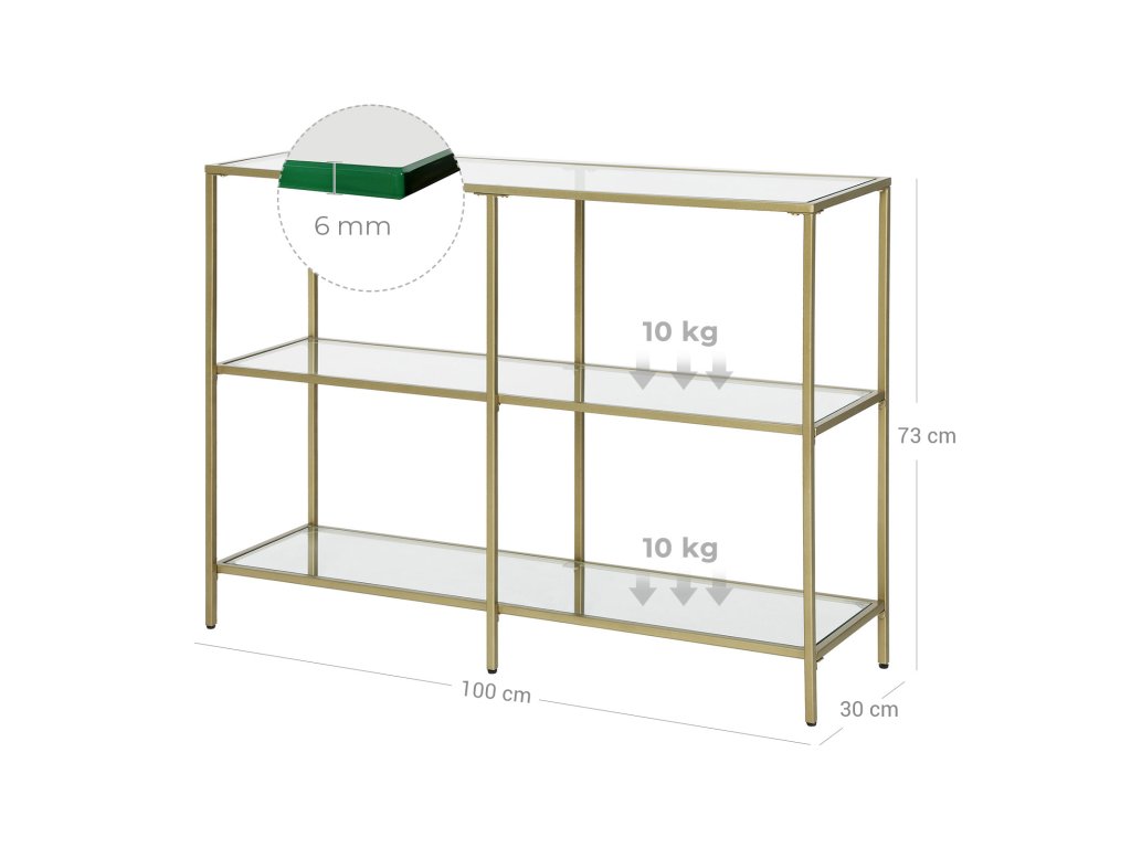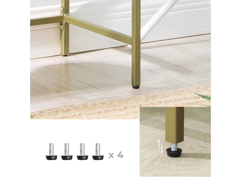 Prostor pro budoucnost: Místo toho, abyste si říkali: "Kdyby tak bylo víc místa na moje nové drobnosti!" proč si hned od začátku nevybrat dostatečně prostorný konzolový stolek? Tento 100 cm dlouhý třípatrový stolek je přesně to pravé.Není třeba být v napětí: Konečně můžete hrdě vystavit své sbírky a poslední, co chcete, je pódium s chatrnými panely a slabou konstrukcí. Tento konzolový stolek s 6mm tvrzeným sklem a stabilním ocelovým rámem rozptýlí vaše obavy.Ozdobte svůj domov: "Okouzlující, elegantní, vznešený" budou přídavná jména, kterými můžete popsat svůj domov po přidání tohoto konzolového stolku se zlatým rámem a čirým sklem, který vylepší váš prostor.Klíčovým slovem je všestrannost: Konzolové stolky obvykle slouží jako dekorace i jako úložný prostor. Díky třem policím se jeho univerzálnost znásobuje: předsíňový stolek, konzola v obývacím pokoji, stojan na rostliny u okna... popusťte uzdu své fantazii!.Nemůžete se dočkat, až se pochlubíte svými sbírkami? Žádný problém! Poskytujeme označené díly a snadno použitelné pokyny, které vám pomohou dokončit montáž co nejdříve.