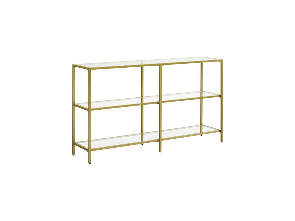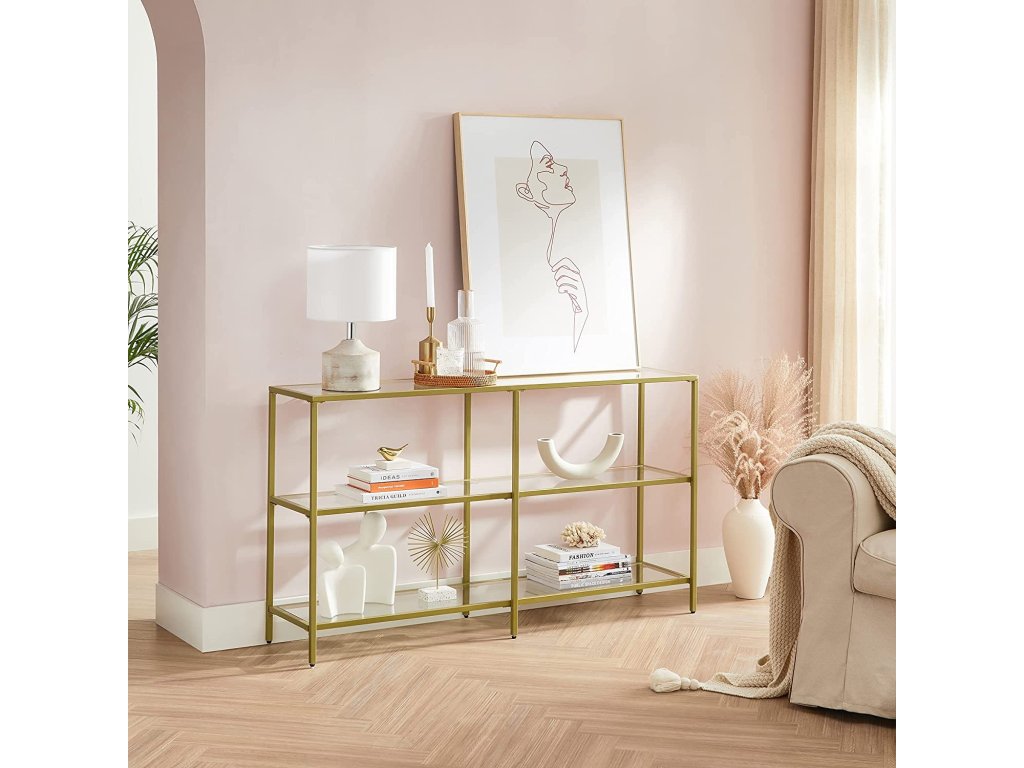 Konzolový stolek, rozkládací stolek se 3 policemi, police z tvrzeného skla, 130 x 30 x 73,3 cm, kovový rám, moderní, do předsíně obývacího pokoje ložnice, zlatá barva.