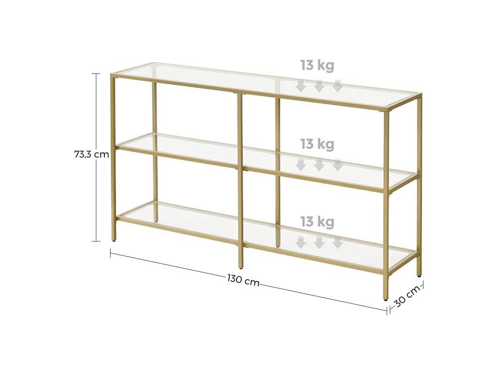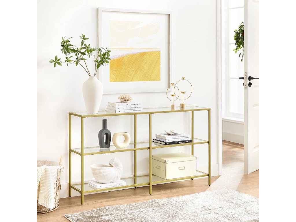 Prostor pro budoucnost: Místo toho, abyste si říkali: "Kdyby tak bylo víc místa na moje nové drobnosti!" proč si hned od začátku nevybrat dostatečně prostorný konzolový stolek? Tento 130 cm dlouhý tříúrovňový stolek je tím pravým.Není třeba být v napětí: Konečně můžete hrdě vystavit své sbírky a poslední, co chcete, je pódium s chatrnými panely a slabou konstrukcí. Tento konzolový stolek s 6mm tvrzeným sklem a stabilním ocelovým rámem rozptýlí vaše obavy.Ozdobte svůj domov: "Okouzlující, elegantní, vznešený" budou přídavná jména, kterými můžete popsat svůj domov po přidání tohoto konzolového stolku se zlatým rámem a čirým sklem, který vylepší váš prostor.Klíčovým slovem je všestrannost: Konzolové stolky obvykle slouží jako dekorace i jako úložný prostor. Díky třem policím se jeho univerzálnost znásobuje: předsíňový stolek, konzola v obývacím pokoji, stojan na rostliny u okna... popusťte uzdu své fantazii!.Nemůžete se dočkat, až se pochlubíte svými sbírkami? Žádný problém! Poskytujeme označené díly a snadno použitelné pokyny, které vám pomohou dokončit montáž co nejdříve.