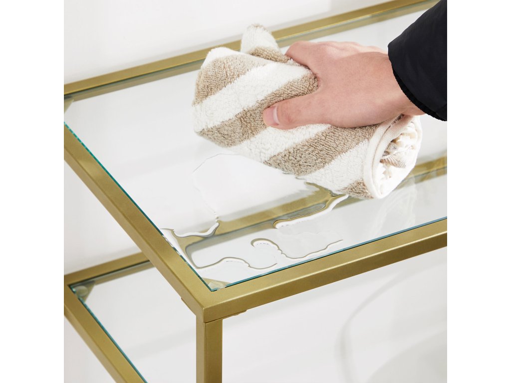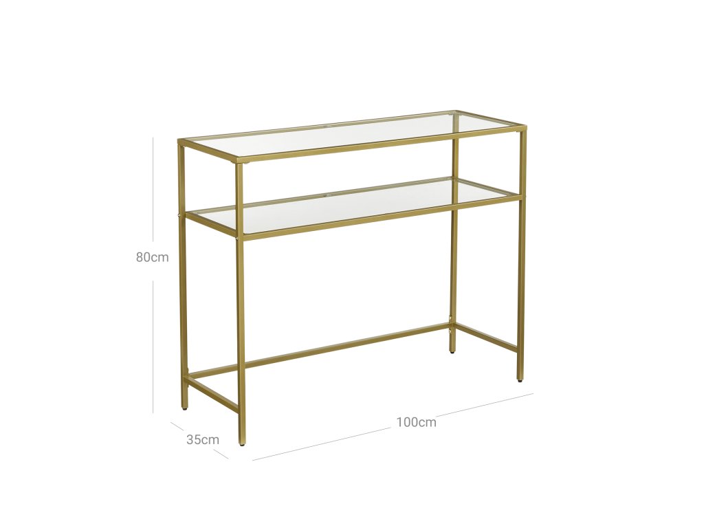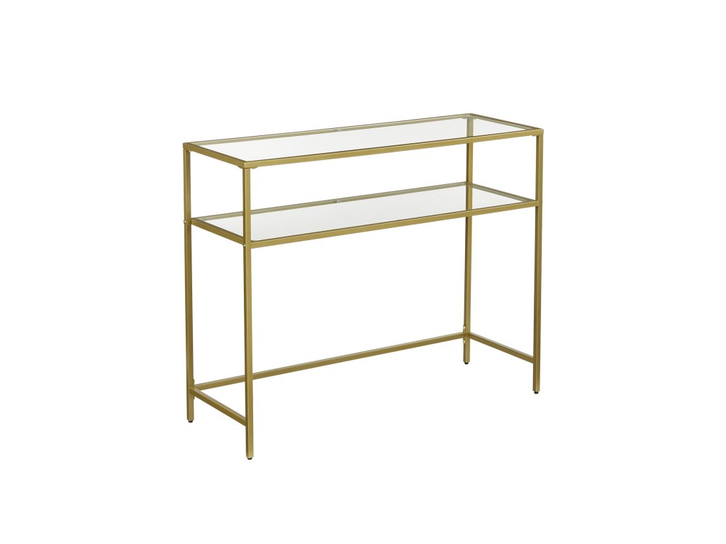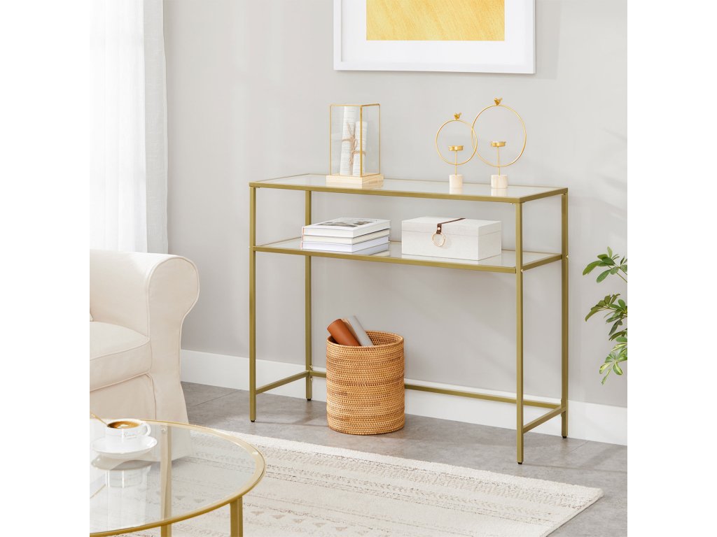 Konzolový stolek, stůl z tvrzeného skla, moderní rozkládací nebo předsíňový stolek, kovový rám, 2 police, nastavitelné nohy, do obývacího pokoje, předsíně, zlatá barva.