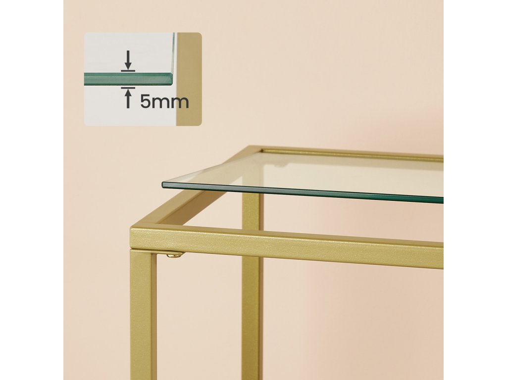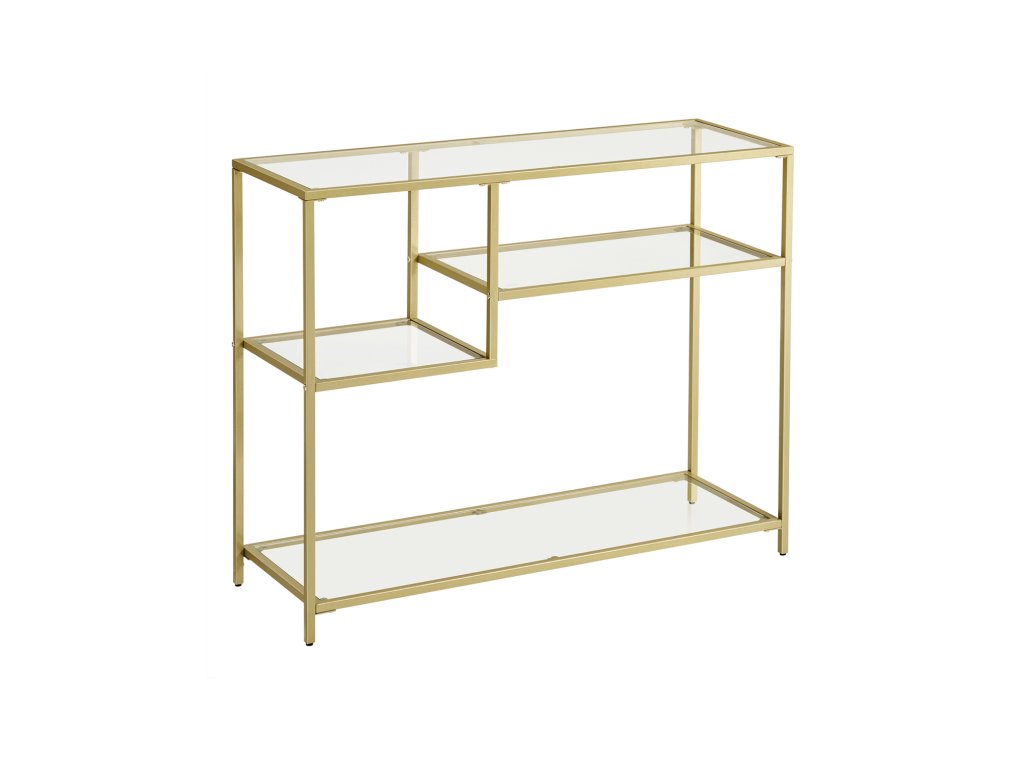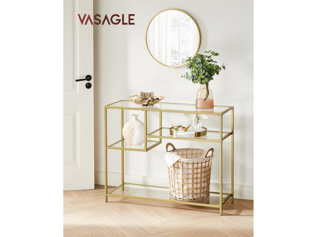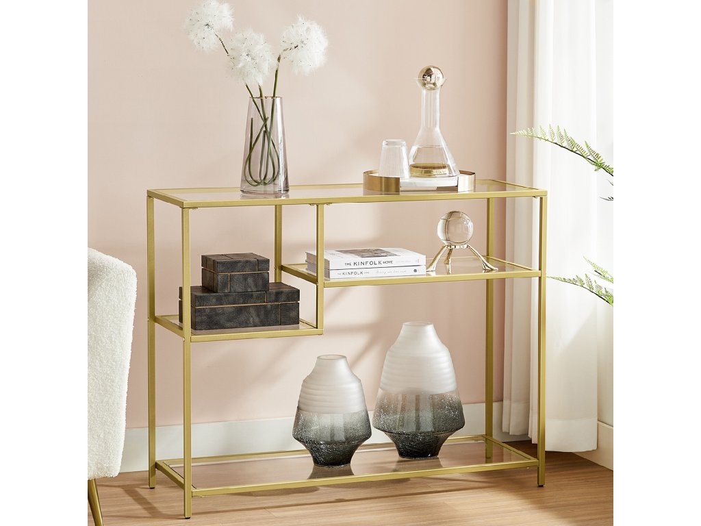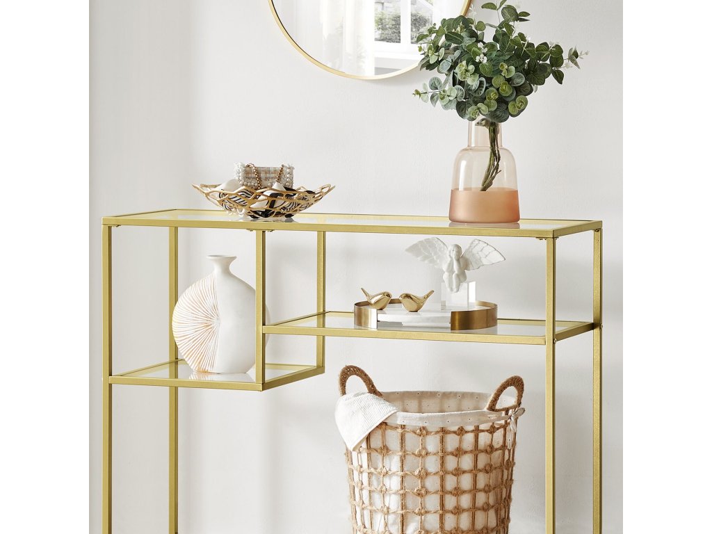LUXUSNÍ A PRAKTICKÝ - Zlatý rám a elegantní tvrzené sklo vytvářejí luxusní a praktický stolek do předsíně. Asymetrické police nejenže nabízejí dostatek prostoru, ale slouží také jako dekorace, která vnese do vašeho pokoje více noblesy.
