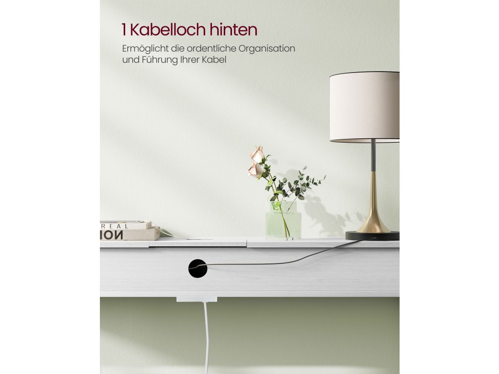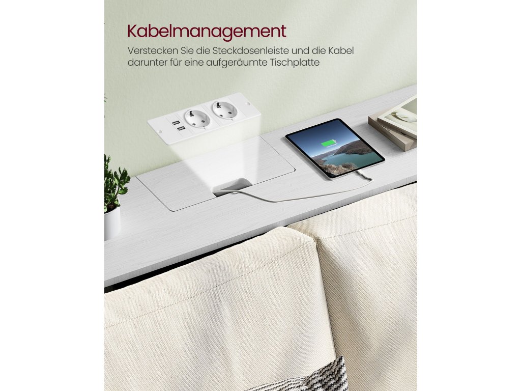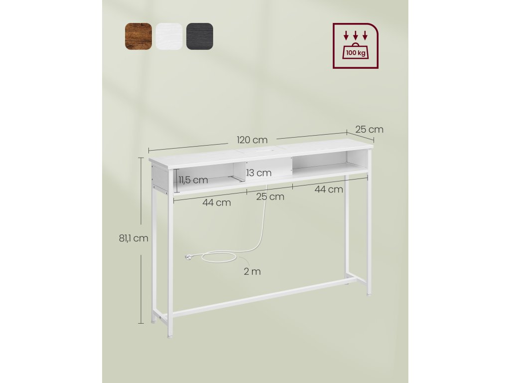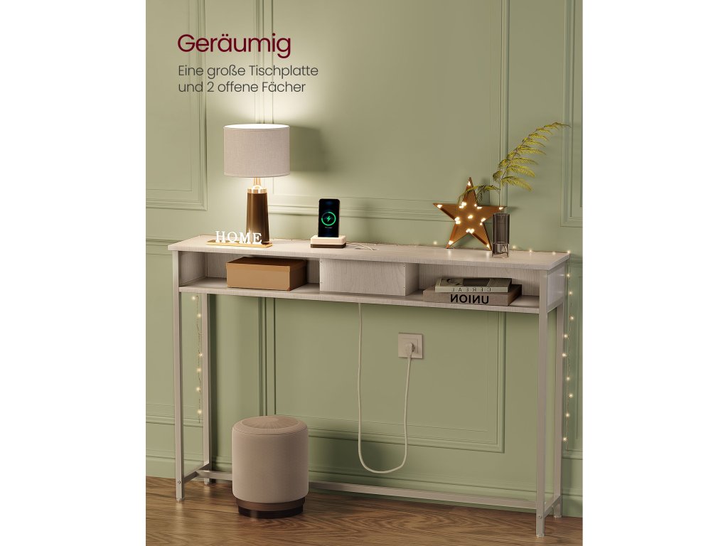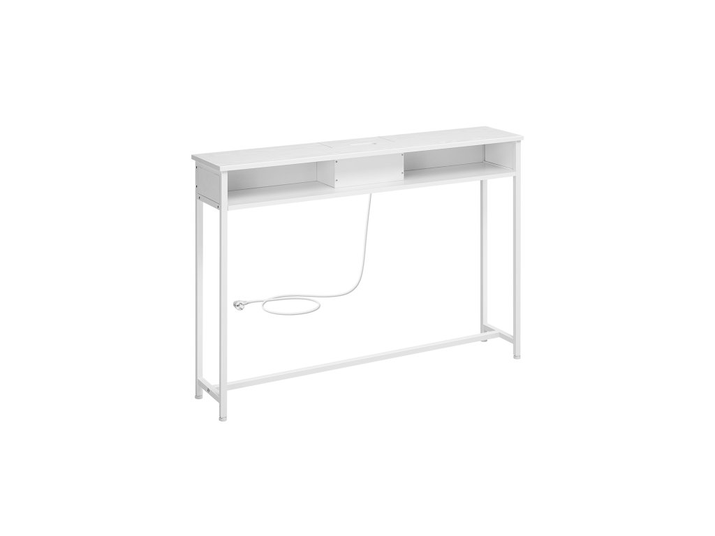 Konzolový stolek s napájecí lištou Díky 2 portům AC a 2 portům USB můžete nabíjet svá zařízení, jako je lampa, telefon, tablet a herní konzole, současně.Úhledná deska stolu Napájecí lišta je ukryta ve snadno přístupné přihrádce a otvor pro kabely na zadní straně pomáhá vést kabely pod ní, aby deska stolu zůstala uklizená.Pro bezpečné použití Pro zajištění bezpečnosti připevněte přiloženou ochranu proti převrácení. Přiložené ochrany rohů chrání před bolestivými nárazy a zajišťují tak bezpečné provozní prostředí.Všestranný] V předsíni na vše, co potřebujete před odchodem ven; za pohovkou pro nabíjení mobilního telefonu nebo vedle stěny pro prezentaci dekorací. Tento stolek s 1 odkládací plochou a 2 přihrádkami splní vaše různé potřeby;