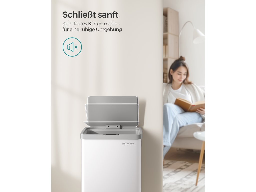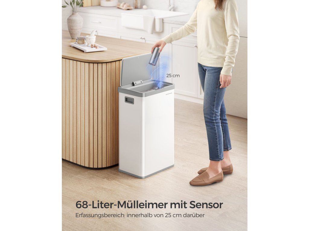 Koš na odpadky se senzorem pohybu, kuchyňský koš na odpadky 68 l, automatický, měkké zavírání víka, funkce Hold Open, ocel, 15 sáčků na odpadky v ceně, bílá.