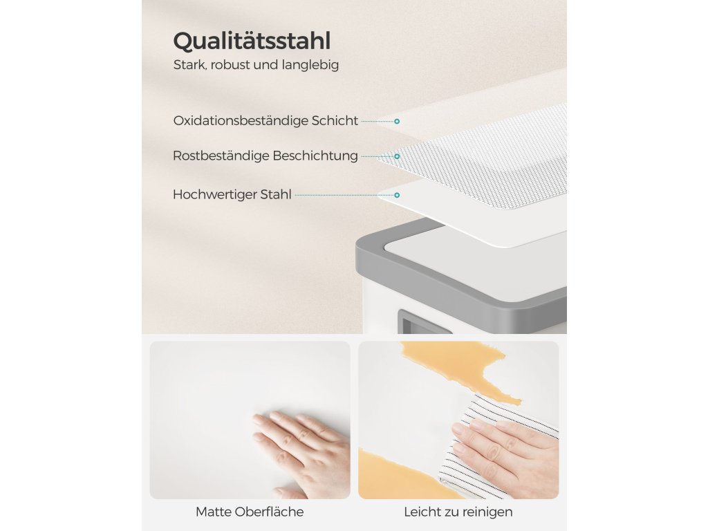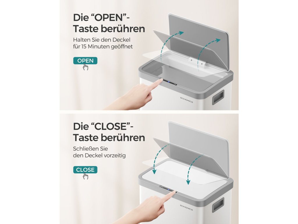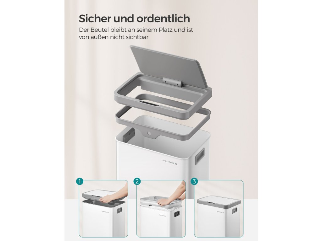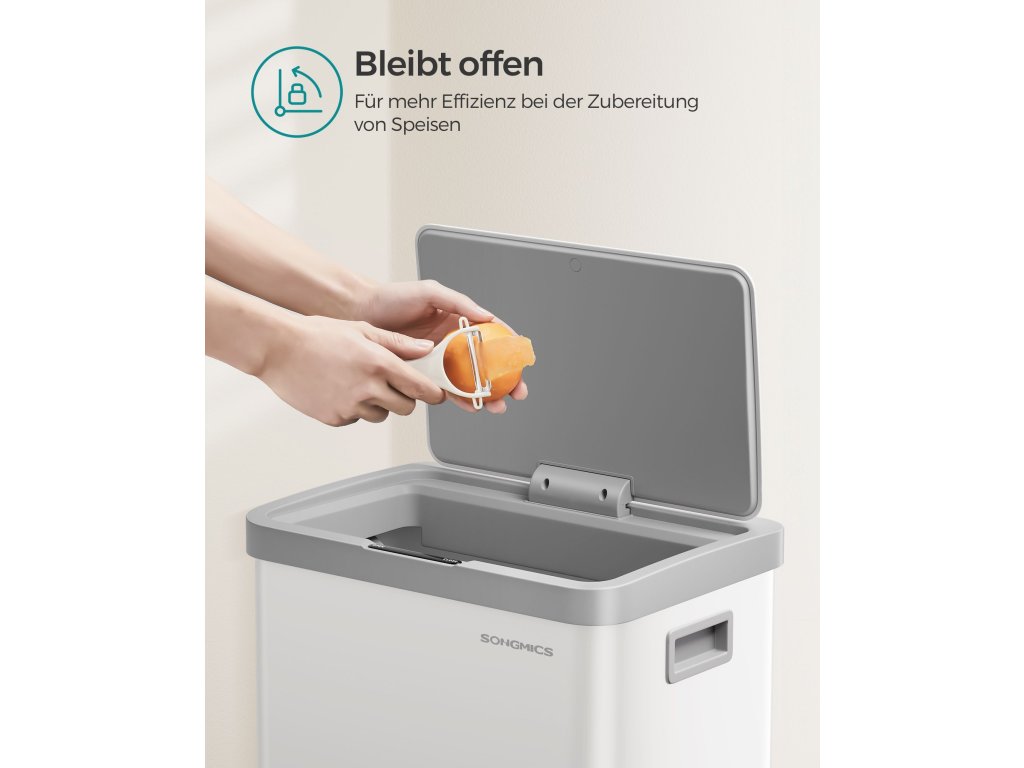 Stylový a prostorný Tento ocelový odpadkový koš zaujme svým elegantním a moderním vzhledem a zároveň se snadno čistí. S objemem 68 litrů vytváří dostatek prostoru pro váš odpad a nabízí praktické řešení pro jeho likvidaci.Senzor pohybu Díky senzoru se víko koše otevře do 0,3 sekundy po zaznamenání pohybu v okruhu 25 cm nad ním a automaticky se zavře o 5 sekund později pro hladký provoz bez použití rukou.Zůstane otevřené Dotykem tlačítka "OPEN" můžete nechat víko otevřené po dobu 15 minut - ideální při přípravě jídla. V případě potřeby jej můžete zavřít dříve dotykem tlačítka "CLOSE".Zavírá se jemně Tiché a pomalé zavírání víka tohoto kuchyňského koše vytváří tiché prostředí a ukončuje hlasité zvuky.Včetně upínacího kroužku a 15 pytlů na odpadky Součástí balení je upínací kroužek, který udržuje pytle na odpadky na místě a mimo dohled. a také 15 pytlů na odpadky, abyste mohli s novou popelnicí začít hned pracovat.| Kategorie: | Odpadkové koše |