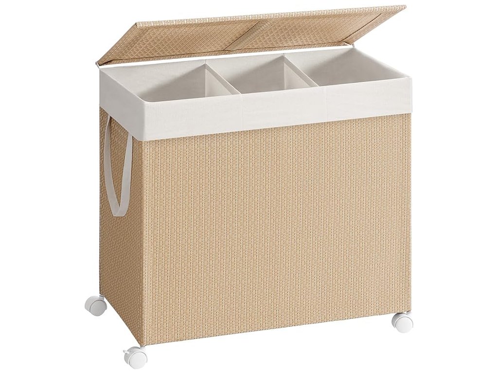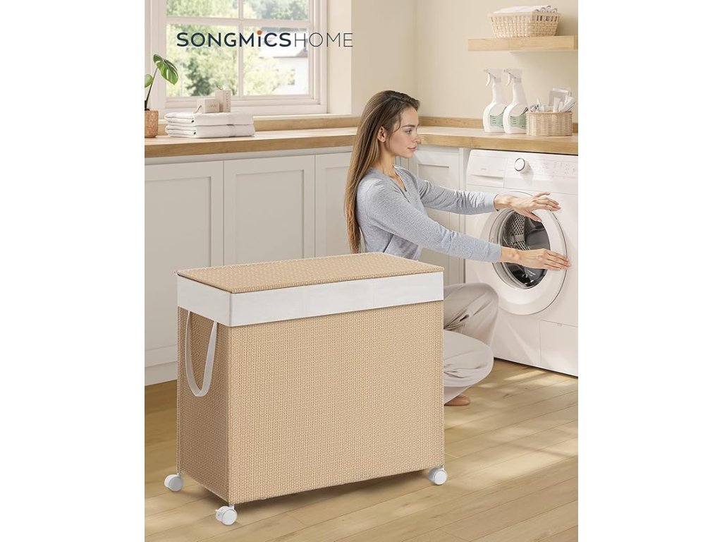 Koš na prádlo se 3 oddíly, velký 140l koš na prádlo na kolečkách, ratanový koš na prádlo s víkem, vyjímatelná vložka s držadly, přírodní béžová a matná bílá.