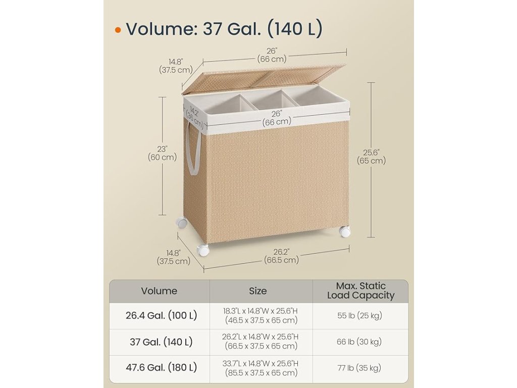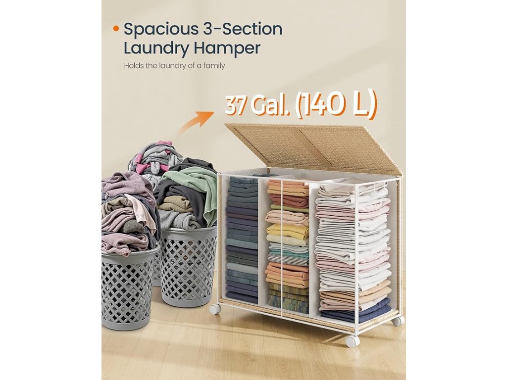 【GENERÁLNÍ ÚLOŽNÝ PROSTOR PRO ORGANIZOVANÉ PRÁDLO】 Tento koš na prádlo s kapacitou 37 galonů poskytuje dostatek prostoru pro rodinné potřeby. Tři přihrádky umožňují efektivní třídění prádla podle barvy nebo typu.