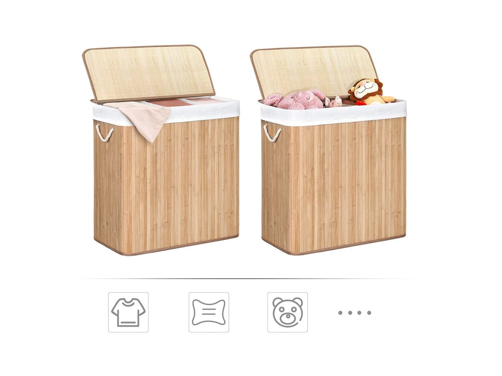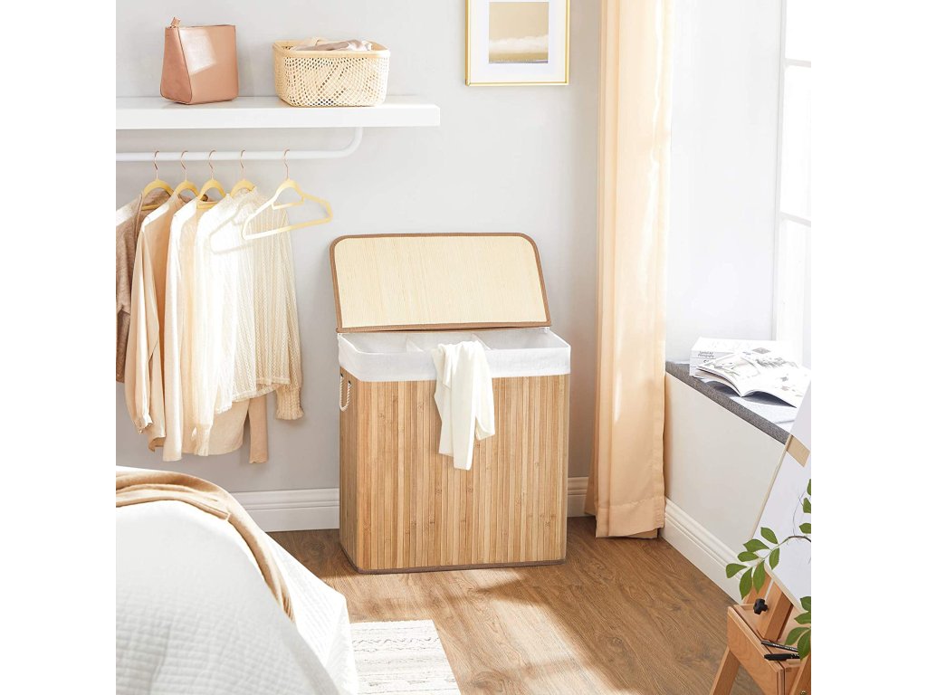 Koš na prádlo s víkem Víko tohoto koše na prádlo lze otevřít a zavřít jednou rukou, takže jím můžete snadno přikrýt prádlo; víko zabraňuje pronikání pachů a chrání prádlo před prachem;Prostorný a tříditelný Tento koš na prádlo o rozměrech 60 x 40 x 61,5 cm (D x Š x V) má velkou kapacitu 150 l pro vaše oblečení, ručníky a ložní prádlo. Tři oddíly umožňují třídit oblečení různých barev.Silné a prostorově úsporné 17 mm široké bambusové lamely jsou odolnější a pevnější a unesou maximální zatížení 25 kg. Když koš na prádlo nepoužíváte, jednoduše jej složíte a ušetříte místo.Vyjímatelná a pratelná vložná taška Vnitřní taška z bavlněné tkaniny o hmotnosti 160 g/㎡ je vyjímatelná, takže ji můžete snadno přenést do prádelny. Pokud se ušpiní, stačí ho hodit do pračky.Snadné sestavení a použití Jednoduchá konstrukce a jasné pokyny vám umožní snadno sestavit tento koš na prádlo. Bavlněná madla na obou stranách vám pomohou tento koš na prádlo snadno přemístit.| Kategorie: | Koše na prádlo |