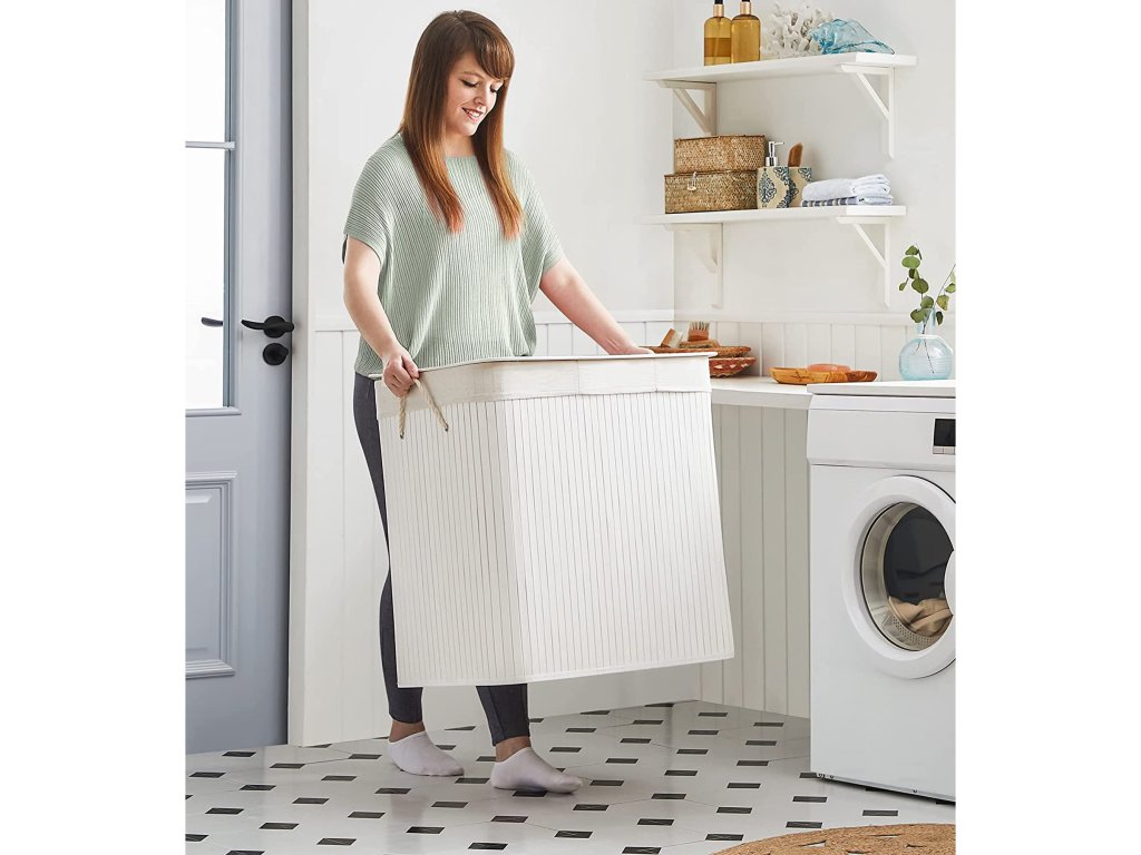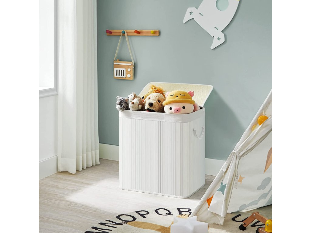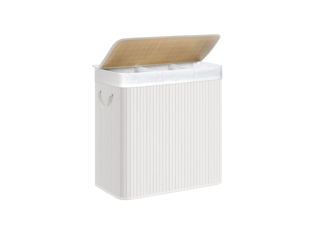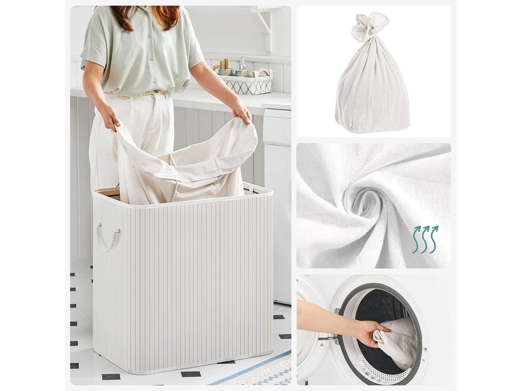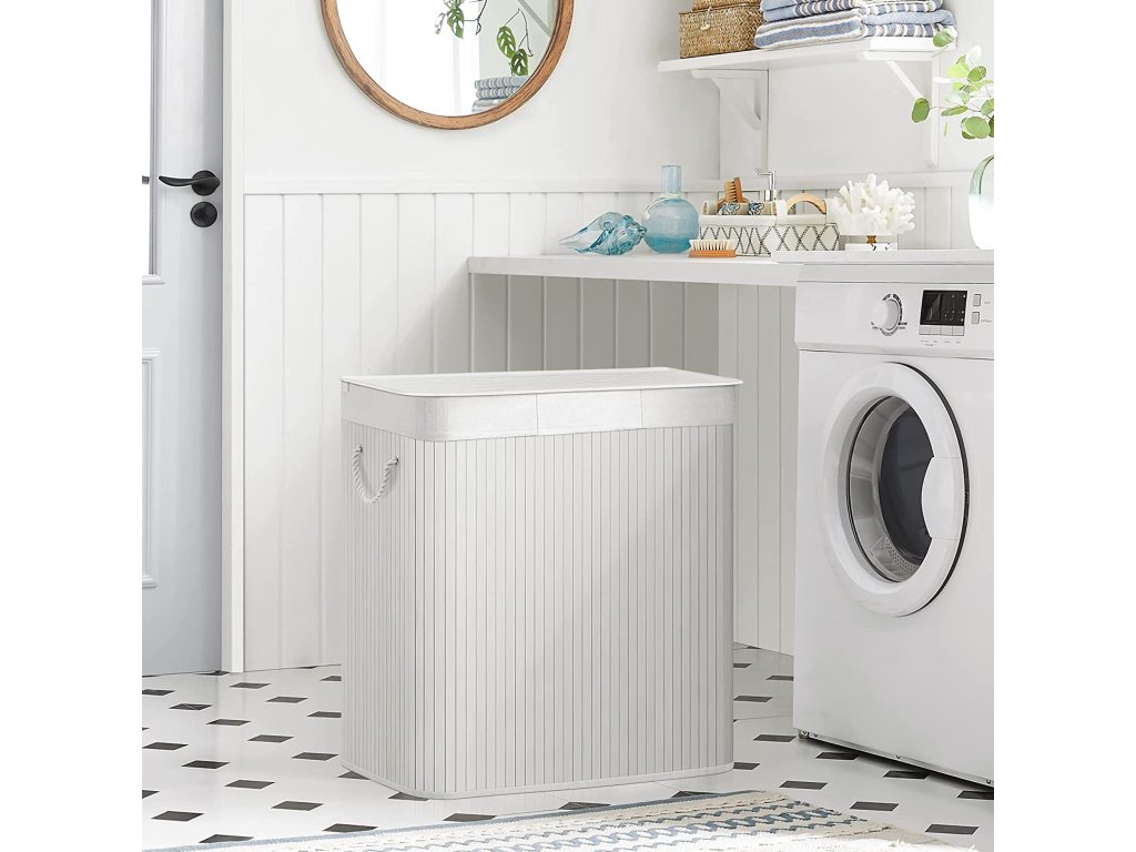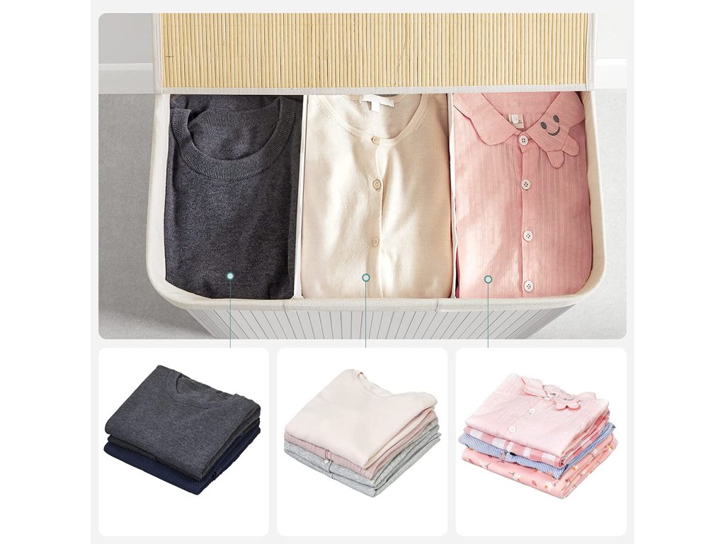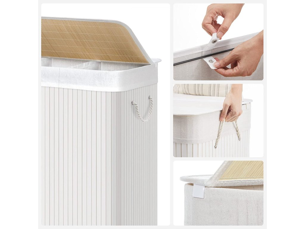Koš na prádlo s víkem Víko tohoto koše na prádlo lze otevřít a zavřít jednou rukou, takže jím můžete snadno přikrýt prádlo; víko zabraňuje pronikání pachů a chrání prádlo před prachem;Prostorný a tříditelný Tento koš na prádlo o rozměrech 60 x 40 x 61,5 cm (D x Š x V) má velkou kapacitu 150 l pro vaše oblečení, ručníky a ložní prádlo. Tři oddíly umožňují třídit oblečení různých barev.Silné a prostorově úsporné 17 mm široké bambusové lamely jsou odolnější a pevnější a unesou maximální zatížení 25 kg. Když koš na prádlo nepoužíváte, jednoduše jej složíte a ušetříte místo.Vyjímatelná a pratelná vložná taška Vnitřní taška z bavlněné tkaniny o hmotnosti 160 g/㎡ je vyjímatelná, takže ji můžete snadno přenést do prádelny. Pokud se ušpiní, stačí ho hodit do pračky.Snadné sestavení a použití Jednoduchá konstrukce a jasné pokyny vám umožní snadno sestavit tento koš na prádlo. Bavlněná madla na obou stranách vám pomohou tento koš na prádlo snadno přemístit.| Kategorie: | Koše na prádlo |
