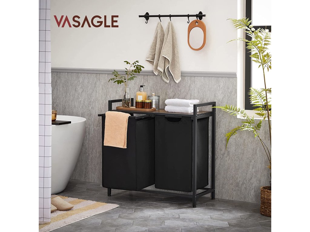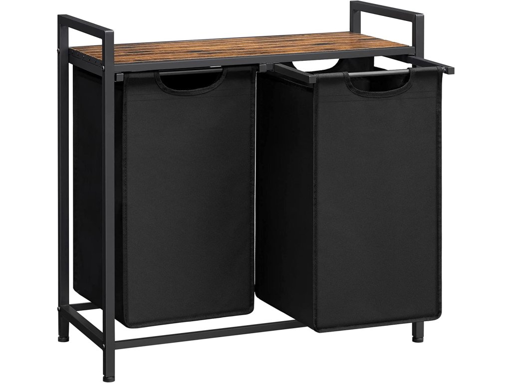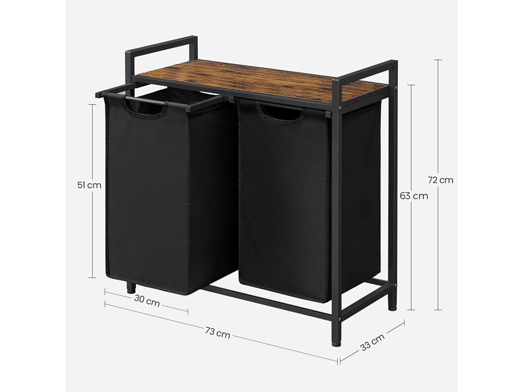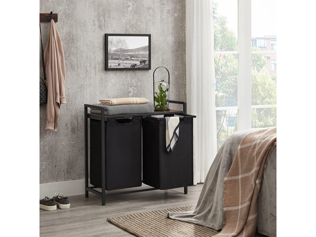 Koš na prádlo, koš na prádlo, 2 snadno výsuvné a vyjímatelné látkové pytle na prádlo Oxford, kovový rám, 2 x 46 D, 73 x 33 x 72 cm, rustikální hnědá a černá.