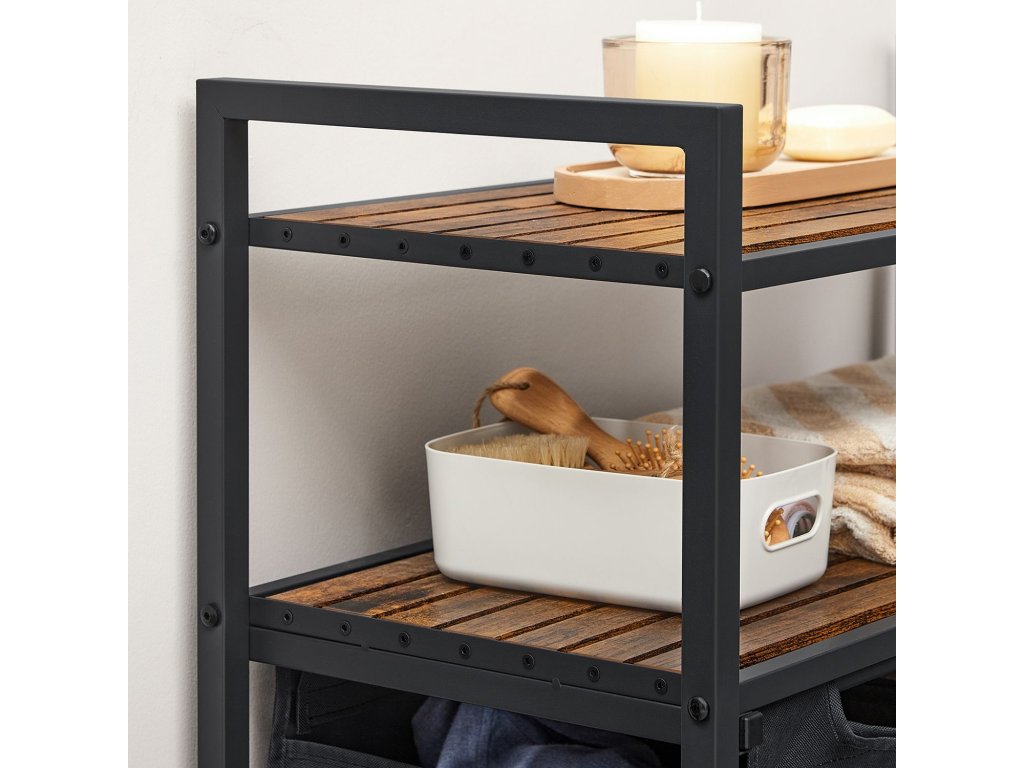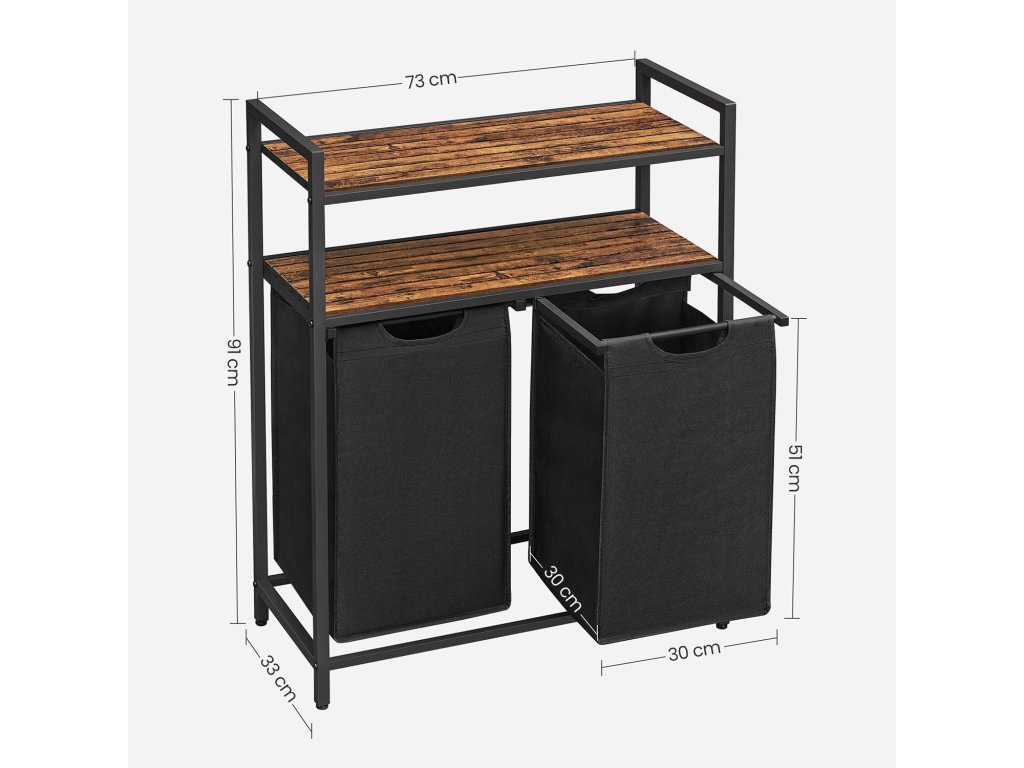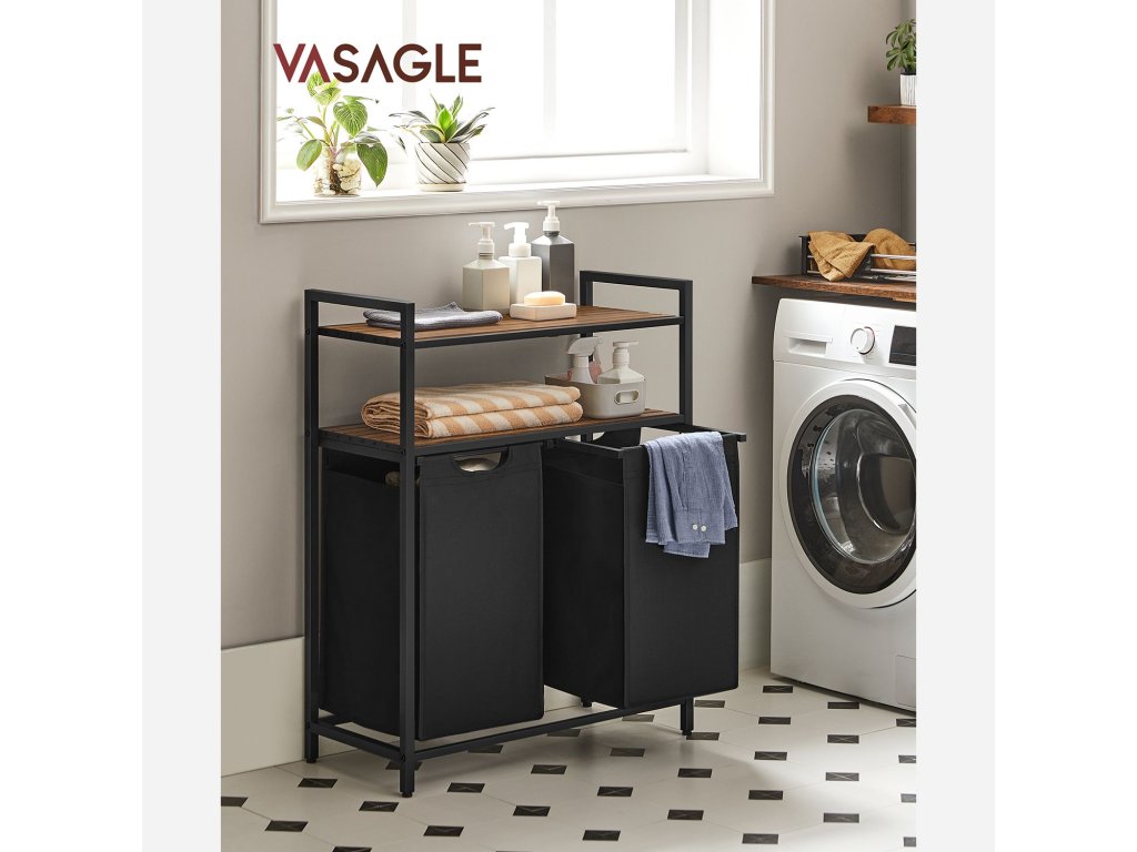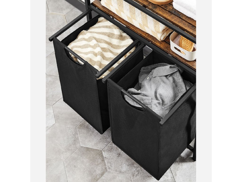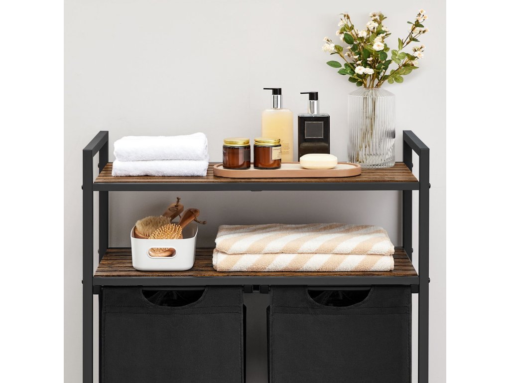 Koš na prádlo, koš na prádlo, třídič prádla se 2 výsuvnými a vyjímatelnými sáčky, 2 úložné police, objem 46 l na jeden sáček, do koupelny, prádelny, rustikální hnědá a černá.