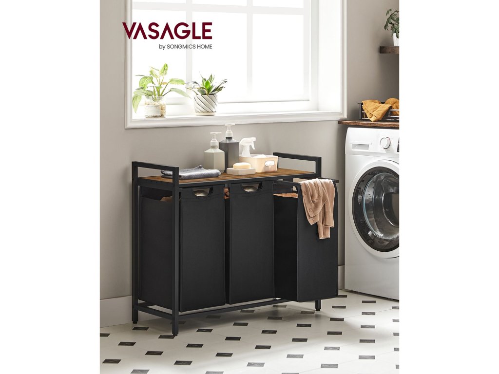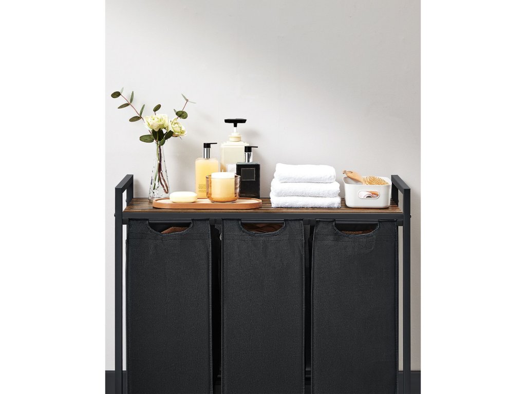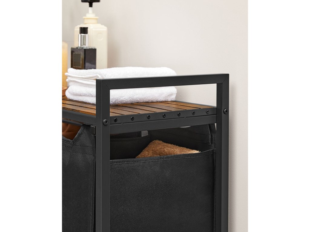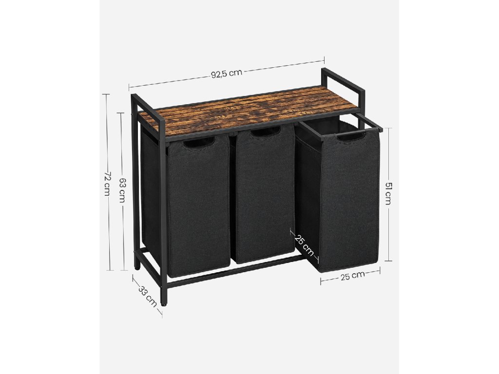 Koš na prádlo, třídič prádla se 3 výsuvnými a vyjímatelnými sáčky, 1 odkládací police, objem 38 l na jeden sáček, do koupelny, prádelny, rustikální hnědá a černá.
