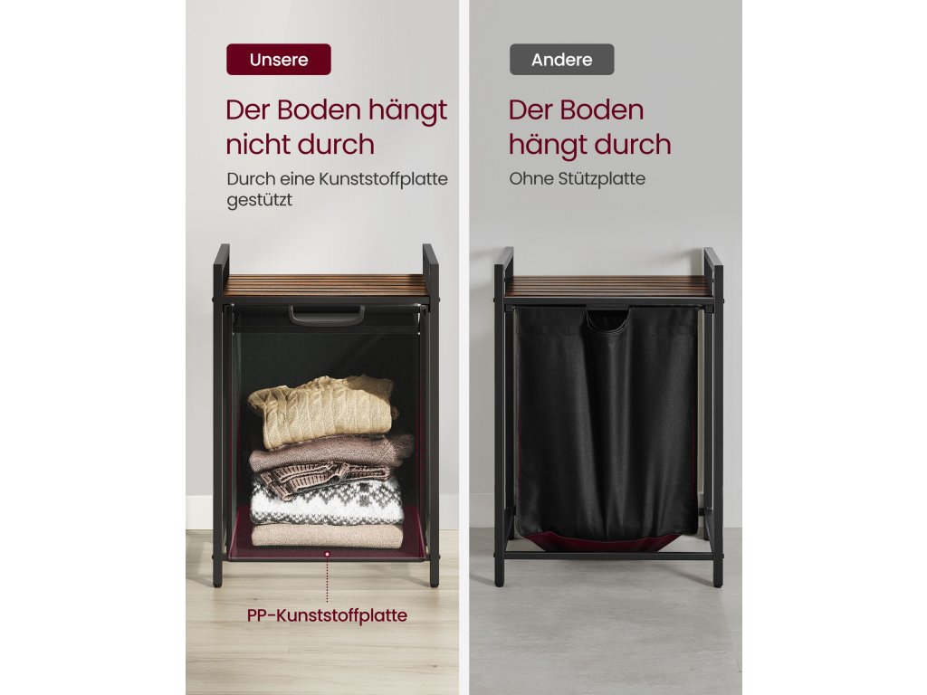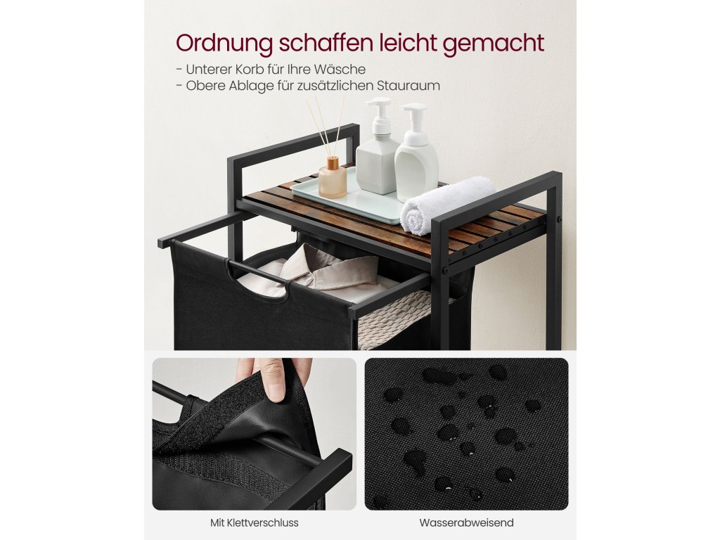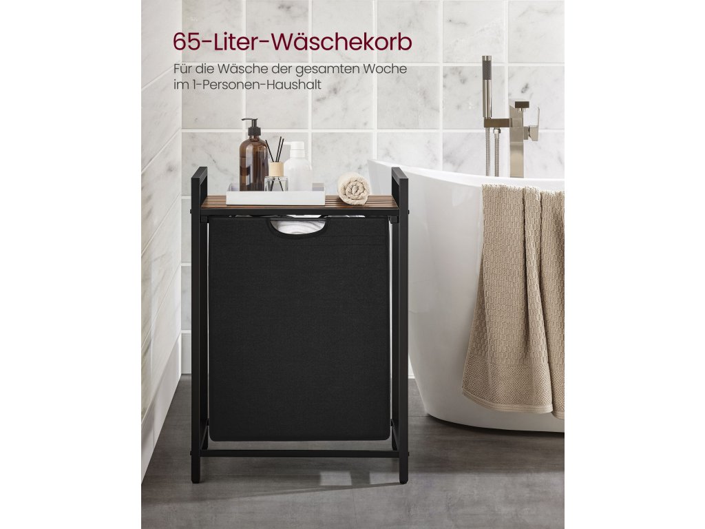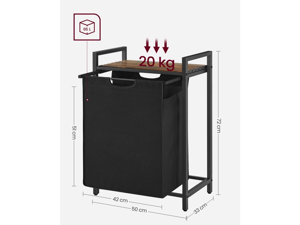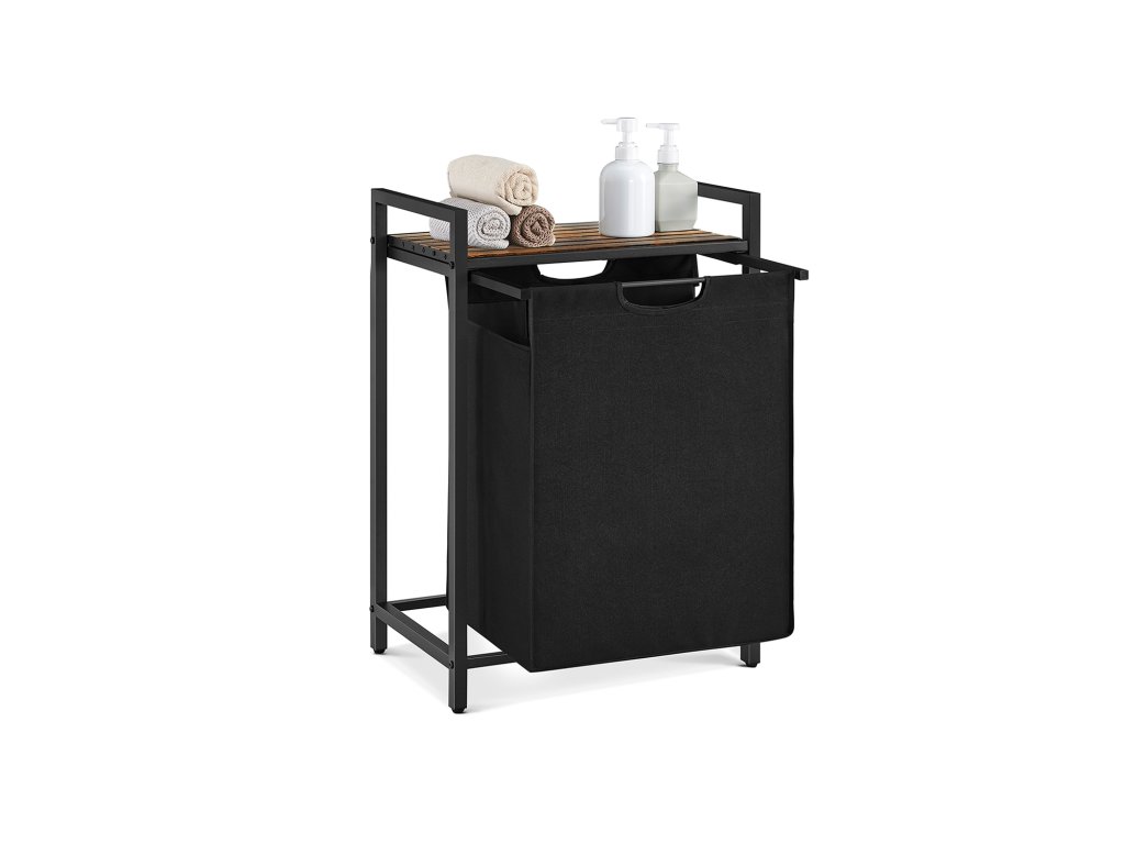Koš na prádlo, koš na prádlo, výsuvný a vyjímatelný vak na prádlo, police, kovový rám, 65 l, 50 x 33 x 72 cm, rustikální hnědá a černá.