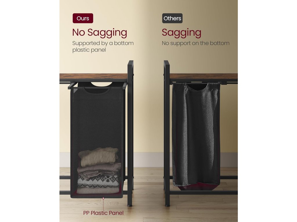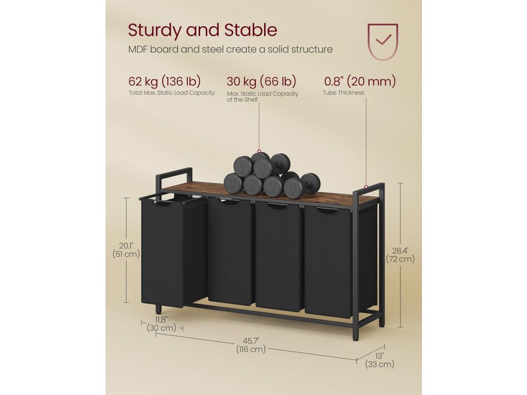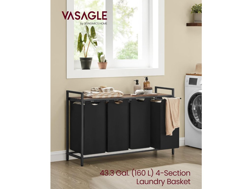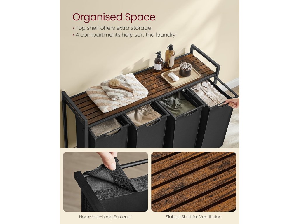 Koš na prádlo, koš na prádlo se 4 přihrádkami, vytahovací a vyjímatelné pytle na prádlo, třídič prádla, police, kovový rám, 4 x 40 l, 116 x 33 x 72 cm, rustikální hnědá a černá.