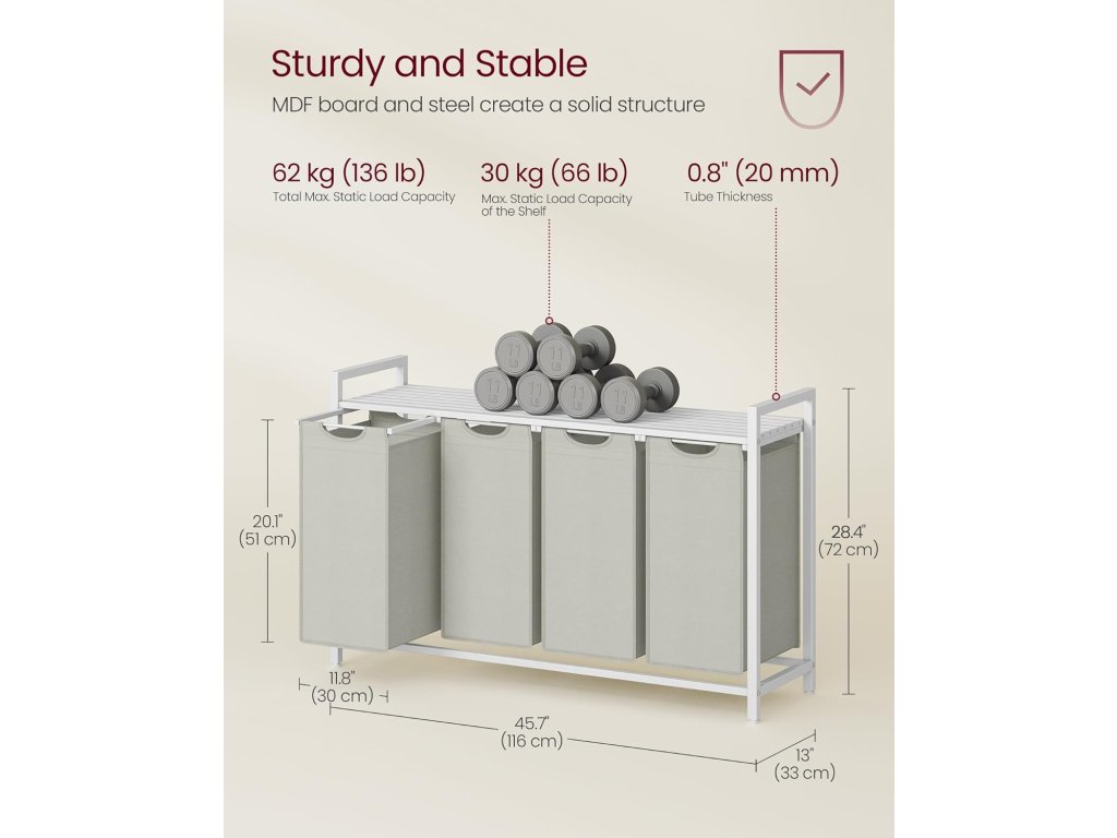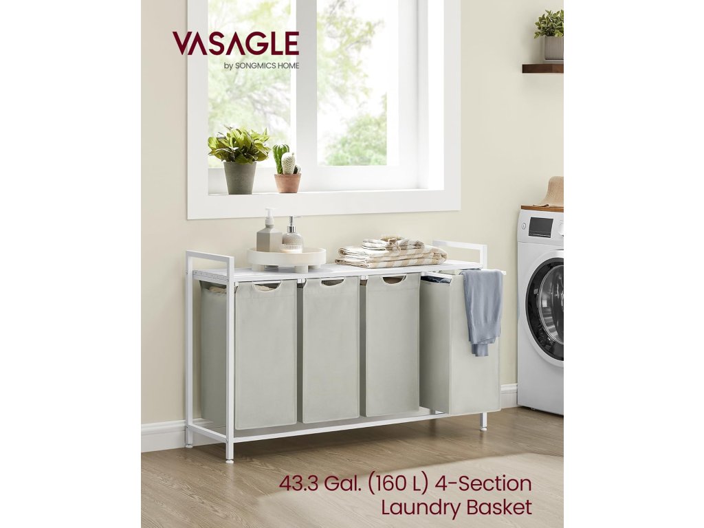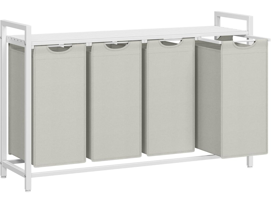 Koš na prádlo, koš na prádlo se 4 přihrádkami, vytahovací a vyjímatelné sáčky na prádlo, třídič prádla, police, kovový rám, 4 x 40 l, 116 x 33 x 72 cm, bílý.