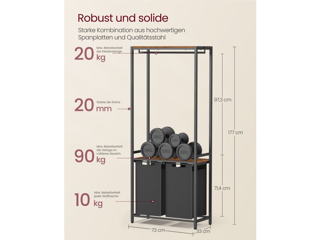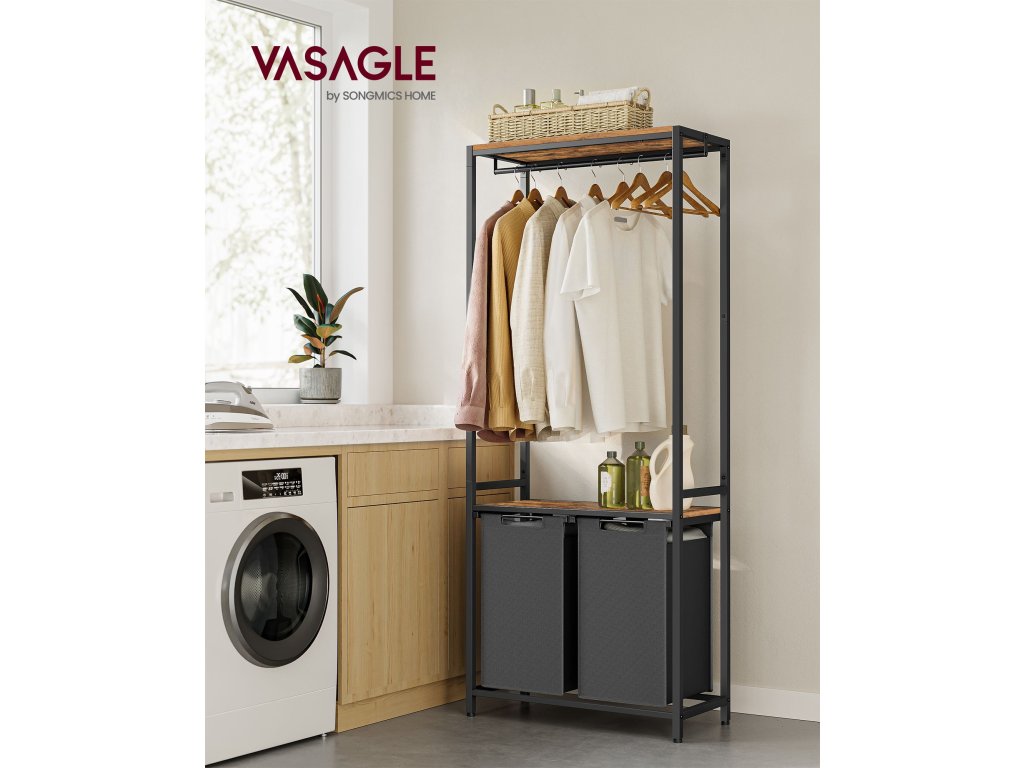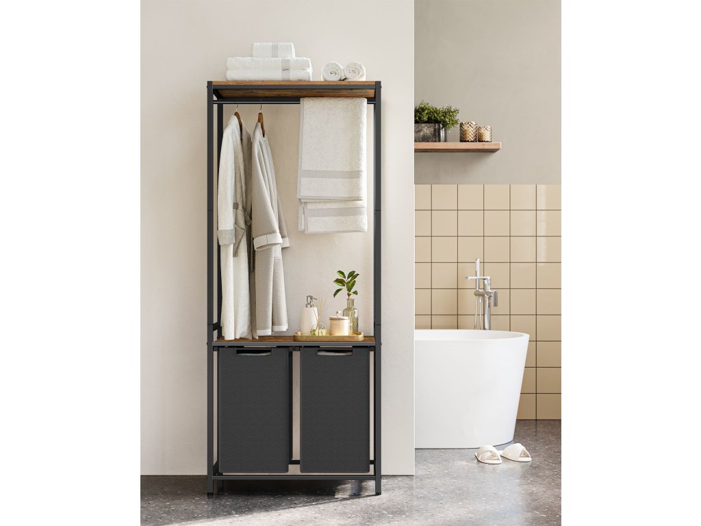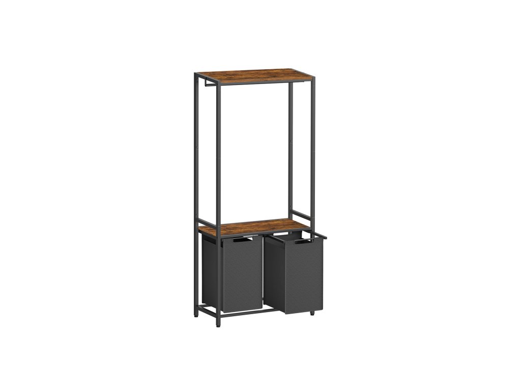 Koš na prádlo se 2 sekcemi, 2 policemi, vyjímatelnými a odnímatelnými vložkami, kolejnicí na oděvy, 2 x 12,1 galonu, 28,7 x 13 x 69,7 palce, rustikální hnědá a černá.