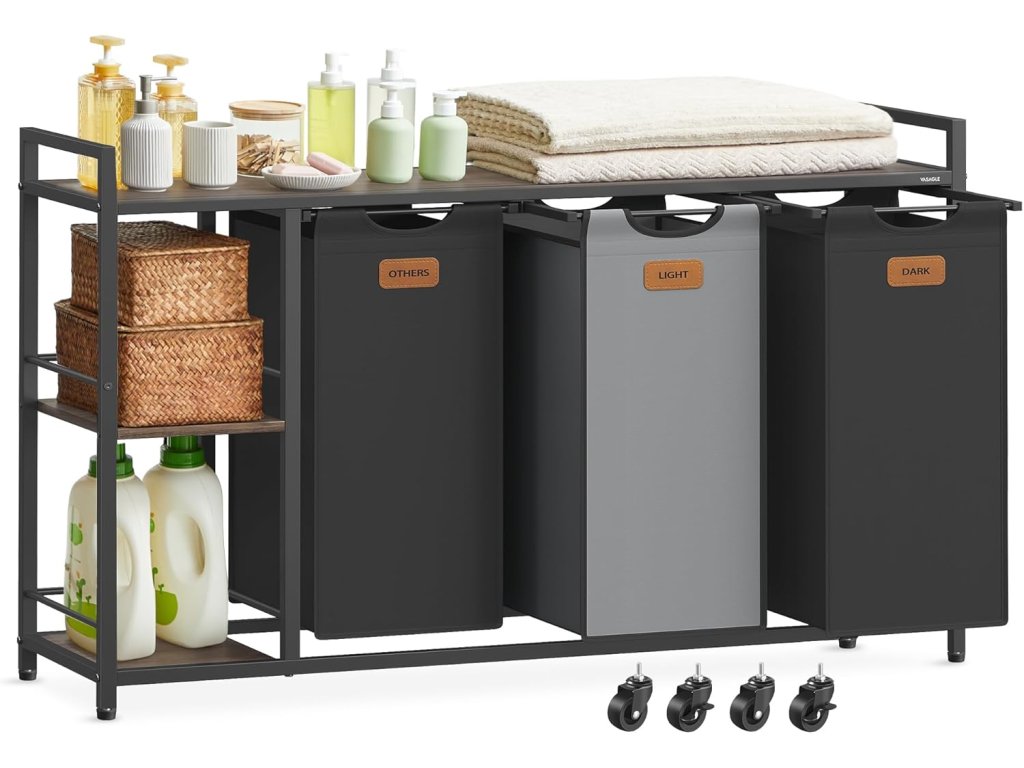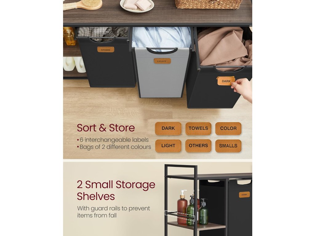 Koš na prádlo se 3 přihrádkami, třídič prádla 150 l, pojízdný vozík na prádlo s policemi, vyjímatelné vložky, 6 štítků, kaštanově hnědý, inkoustově černý a holubičí šedá.