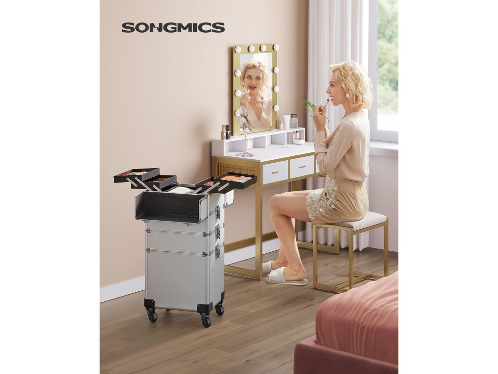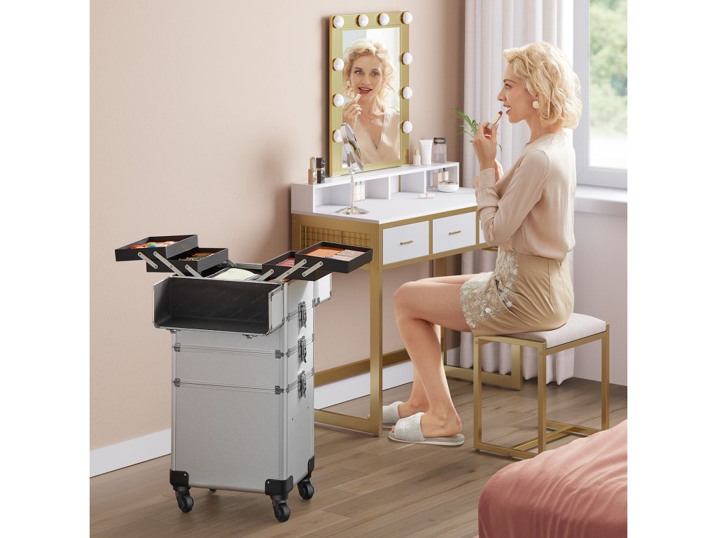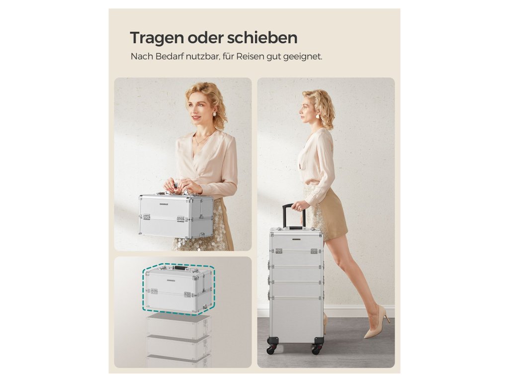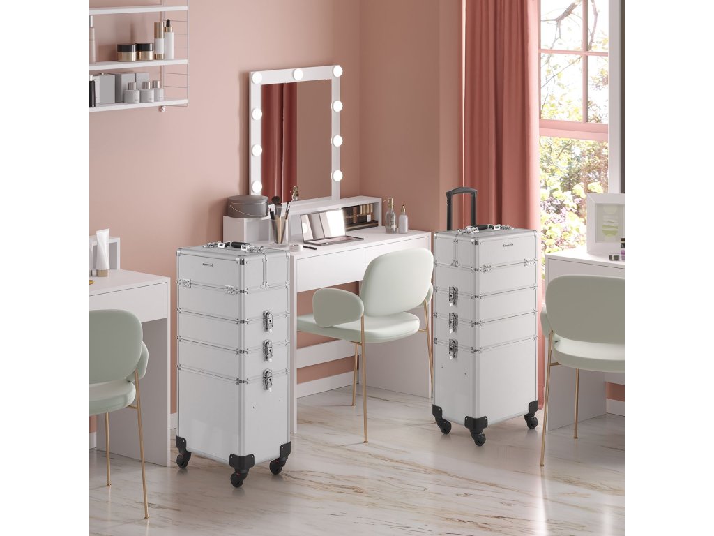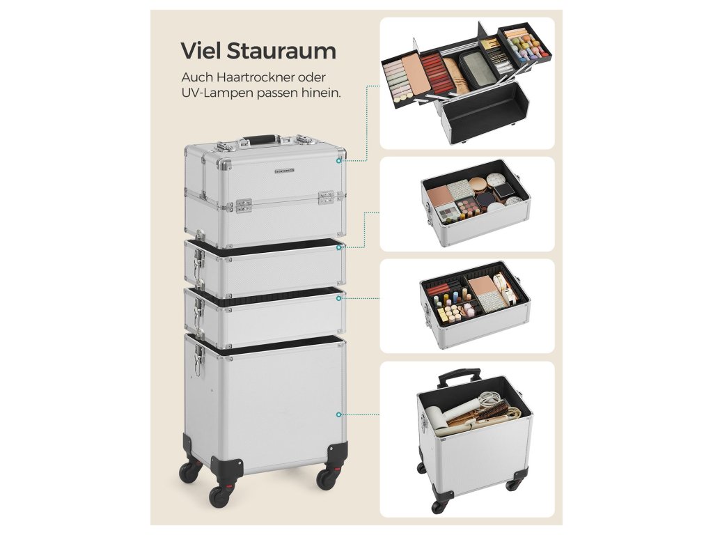 Kosmetický kufřík, kufřík na kolečkách, kosmetický kufřík 4 v 1, cestovní kufřík, velký kadeřnický kufřík, uzamykatelný, univerzální kolečka otočná o 360°, stříbrný.