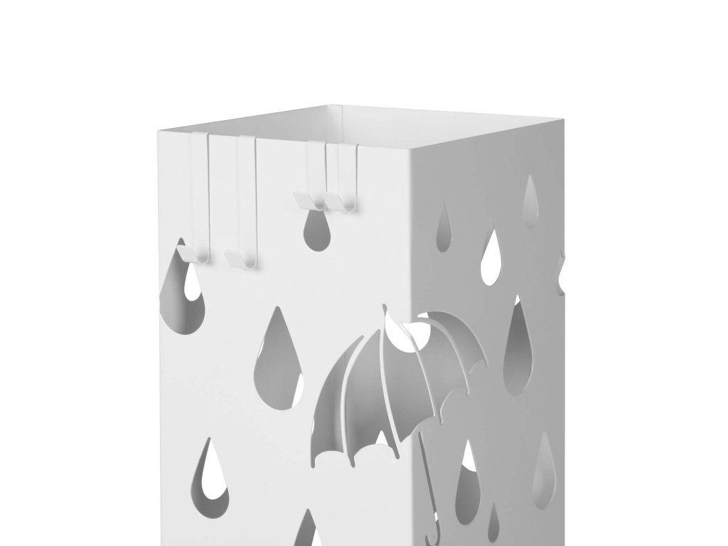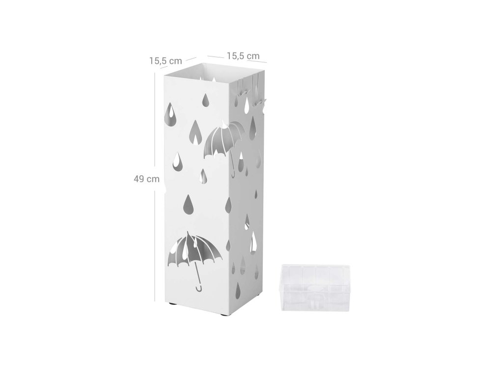 Kovový stojan na deštníky, čtvercový držák na deštníky s odkapávací miskou a 4 háčky, 15,5 x 15,5 x 49 cm, bílý.