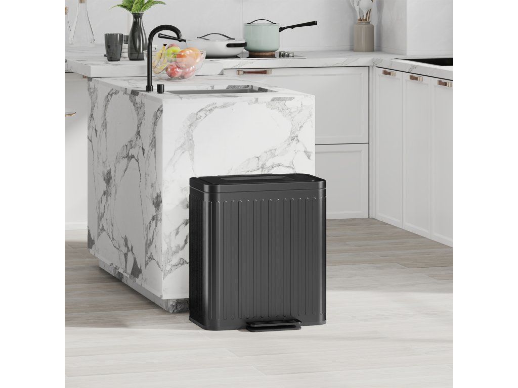 Zlepšete hygienu s kompaktním dvojitým pedálem o objemu 40 l – ideálním do kuchyně a dalších místností. Vyroben z robustního kovu s práškovým nástřikem, je připraven ke každodennímu použití. Dvoukomorová konstrukce usnadňuje třídění odpadu. Víko zůstává otevřené pro snadné čištění. Užívejte si efektivní a jednoduché nakládání s odpadem s tímto kuchyňským košem.