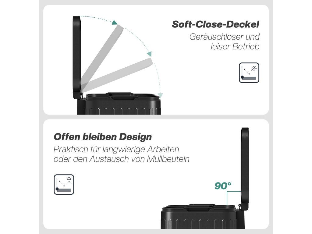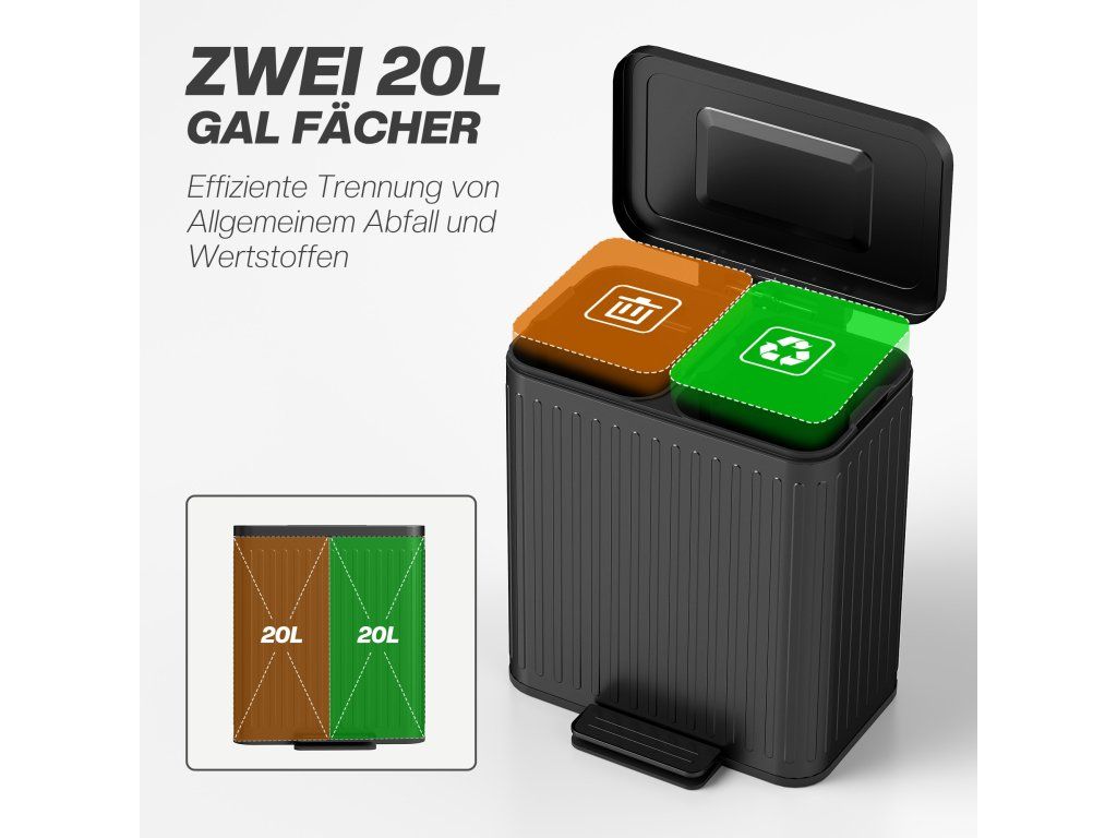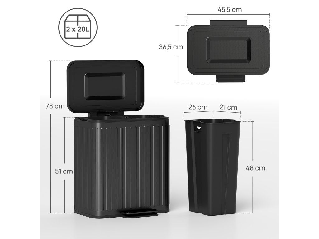 ✔ Objem 2 x 20 l: Koš s víkem nabízí dostatek prostoru a umožňuje flexibilní třídění odpadu.