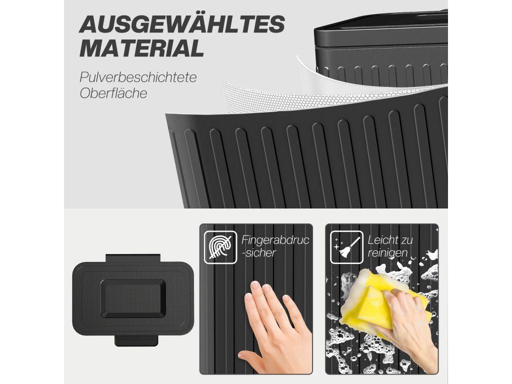 Kovové tělo odolné proti otiskům prstů: Robustní práškově lakovaná povrchová úprava činí tento kuchyňský odpadkový koš s pedálem obzvláště odolným a vhodným pro každodenní použití. Zabraňuje usazování otisků prstů a snadno se hygienicky čistí.