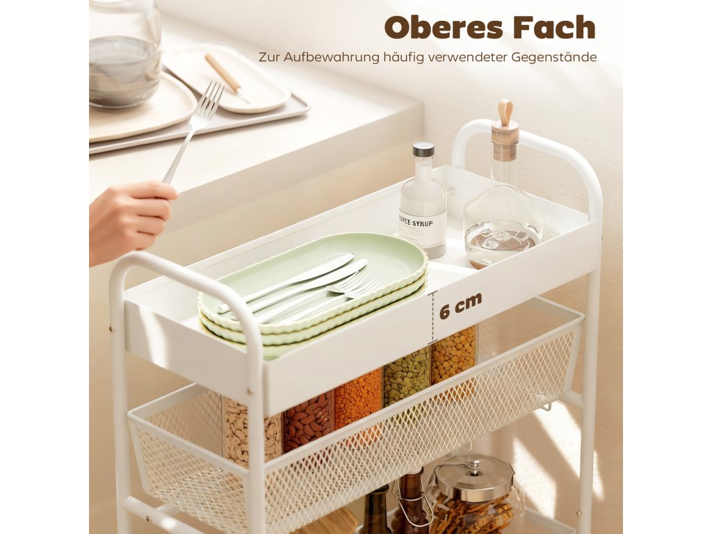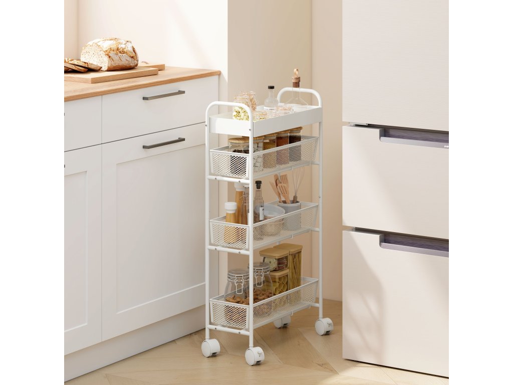 Máte málo místa na kuchyňské lince nebo vás nebaví přeplněné pracovní desky? Kuchyňský vozík promění úzké rohy v praktický úložný prostor. Tři výsuvné síťované koše a praktický horní tác udrží ovoce a zeleninu čerstvé a bez zápachu. Kompaktní rám vozíku se plynule otáčí na kolečkách otočných o 360° a bezpečně se zajistí, zatímco robustní kovový rám odolává vlhkosti a každodennímu používání.