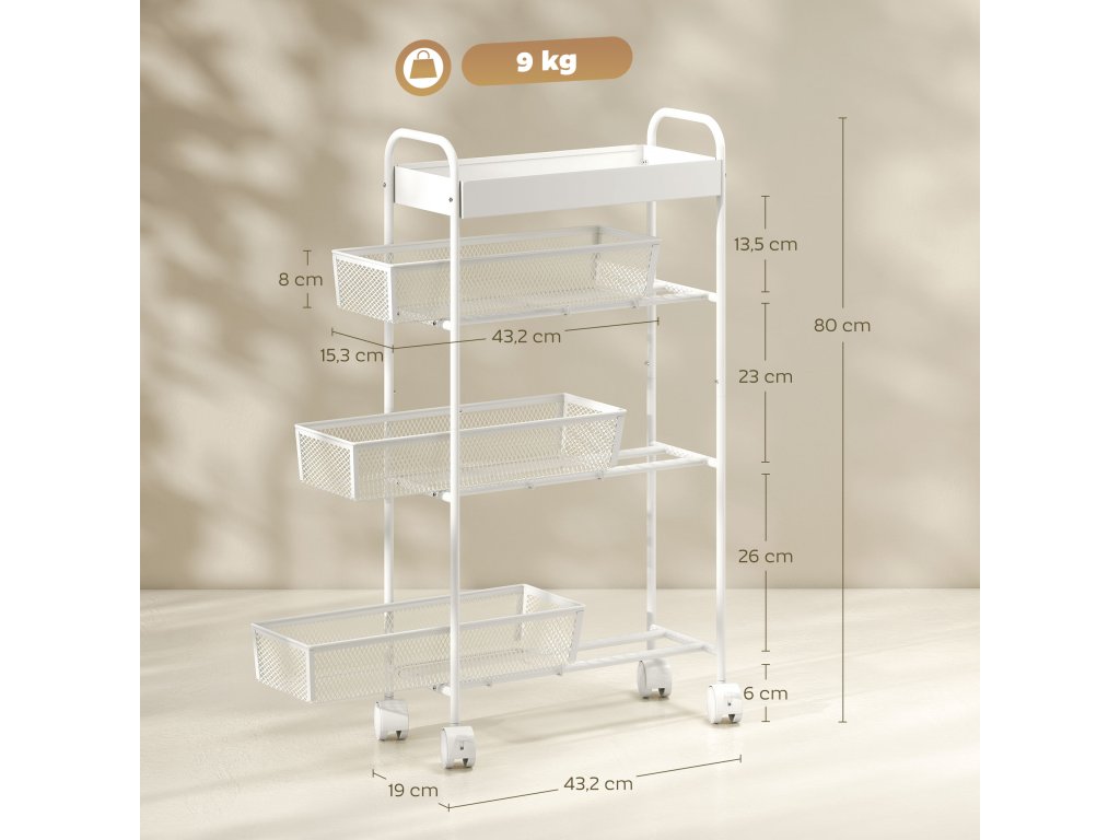 Kompaktní design: S rozměry 43,2 x 19 x 80 cm se tento vozík perfektně vejde do malých prostor vedle lednice, skříněk nebo pračky a promění nevyužité rohy v užitečný úložný prostor.