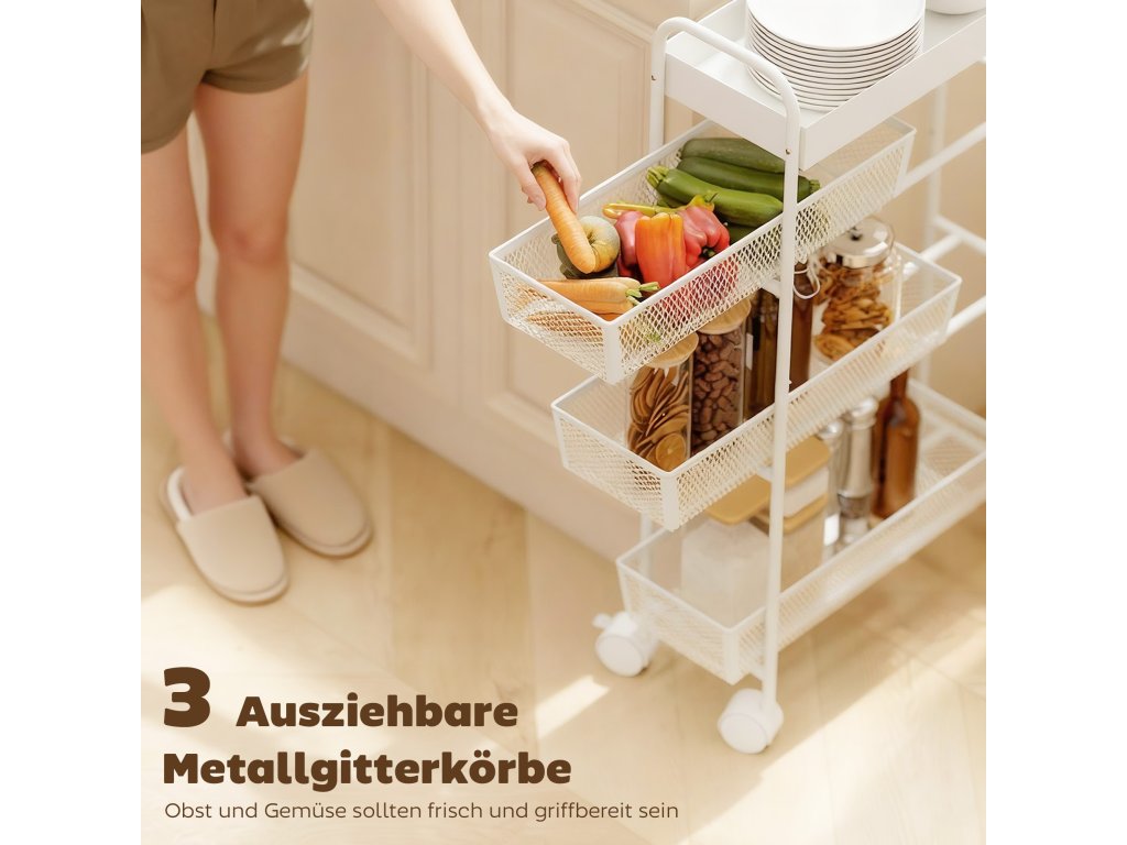 ✔ Tři výsuvné drátěné koše servírovacího vozíku udržují ovoce a zeleninu čerstvé a bez zápachu.
