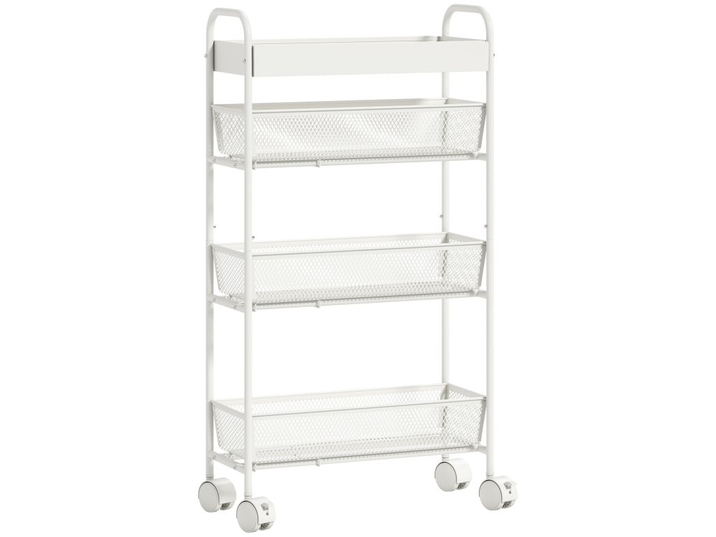 Tři koše a tác: Tento servírovací vozík je vybaven třemi výsuvnými kovovými drátěnými košíky a horní policí, takže ovoce a zelenina budou optimálně větrané a bez nepříjemných pachů.