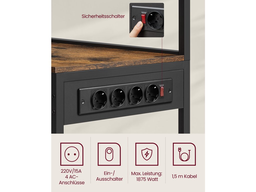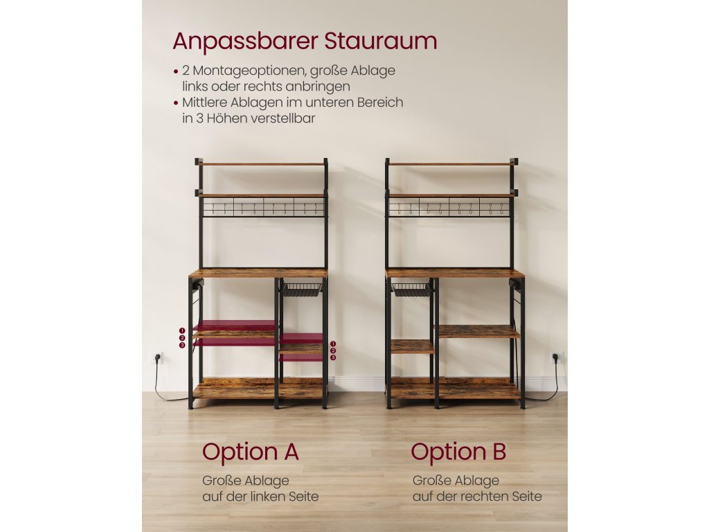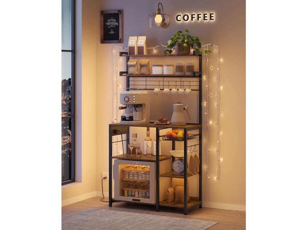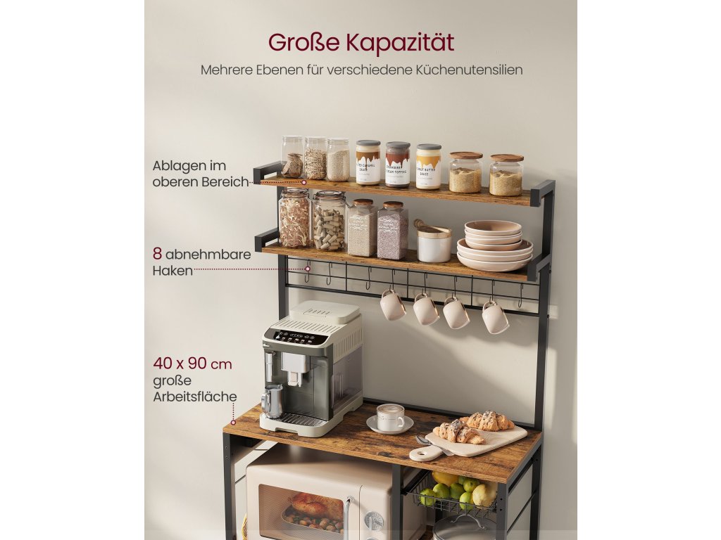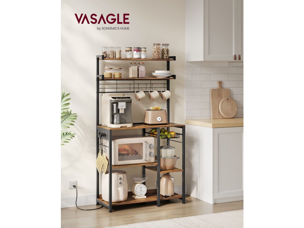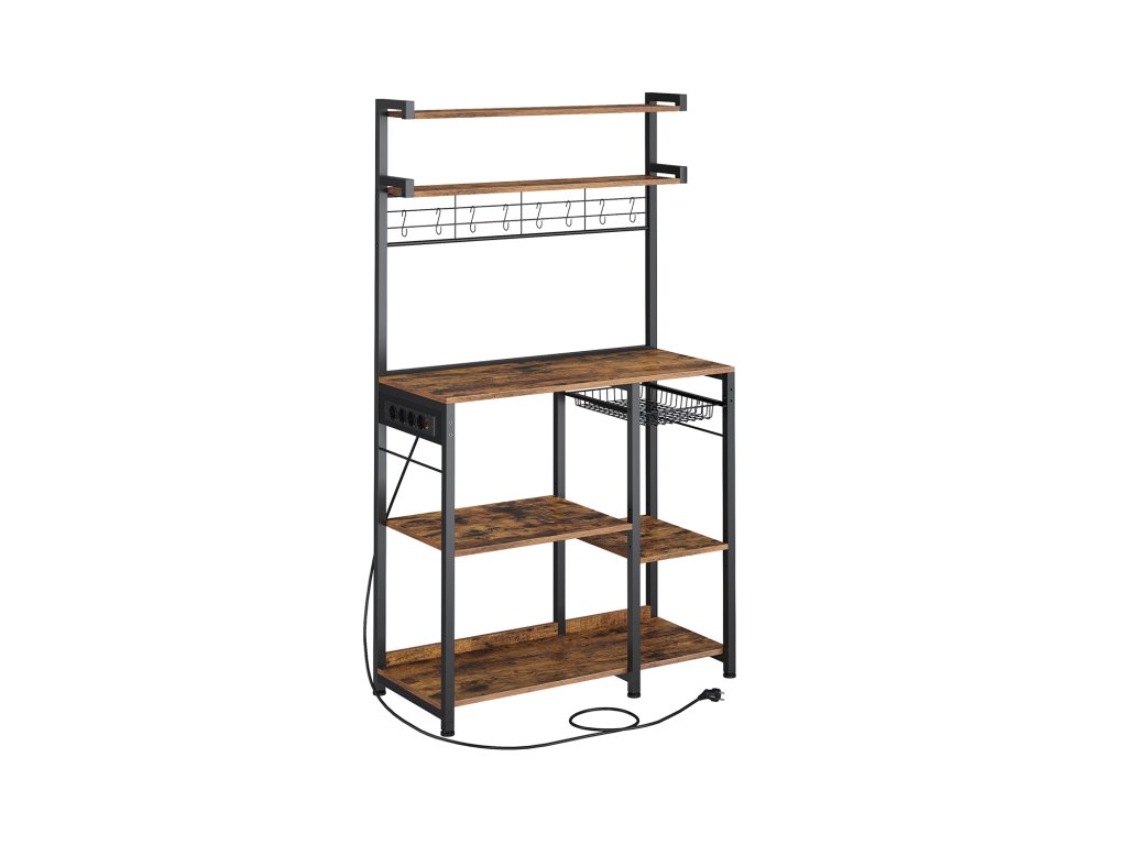 Bezpečná nabíjecí stanice Tento stojan na pečivo má napájecí lištu se 4 zásuvkami na střídavý proud, vybavenou ochranou proti přetížení a úniku a vypínačem, který poskytuje bezpečné napájení pro více zařízení.Nastavitelné a flexibilní Každá ze 2 spodních středních polic je výškově nastavitelná ve 3 úrovních, aby se do ní vešly věci různých velikostí. Kromě toho nabízí spodní prostor 2 možnosti nastavení pro všechny potřebyVíceúčelová Tato police má 8 S-háčků na zavěšení šálků nebo naběraček, 2 horní police na uložení koření nebo nádob na cereálie a výsuvný koš na příbory, čímž maximalizuje úložný prostor v kuchyni.Robustní, stabilní, stylový Dřevotřískové desky a ocelové trubky o tloušťce 2 cm zajišťují vysokou stabilitu. Nastavitelné nožičky a ochrana proti převrácení zajišťují bezpečnost a vintage hnědá povrchová úprava se hodí k mnoha dekoracím.Snadná montáž Díky přehlednému návodu a označeným dílům je montáž této kuchyňské police hračkou. Díky tomu si můžete rychle uspořádat pracovní desku a užívat si prostornějšího prostředí v kuchyni.| Kategorie: | Regály a poličky |