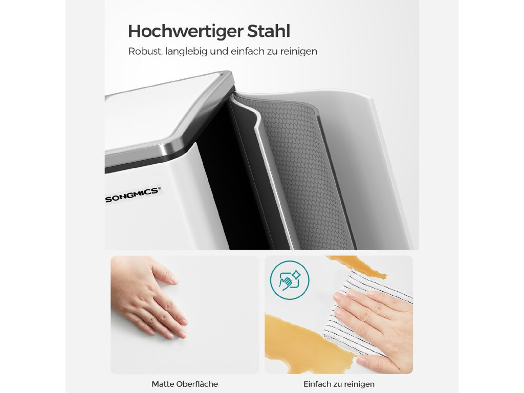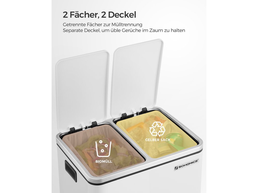 Výhoda pro vaši kuchyni: Díky elegantní bílé barvě a jednoduché siluetě bude tento odpadkový koš v kuchyni poutat pozornost.Krok pro třídění při přehazování: Díky 2 přihrádkám je třídění odpadu snadné; stačí sešlápnout pedál, abyste otevřeli víko, a máte volné ruce k vyhození odpadu;Má to i měkkou stránku: Přestože je vyroben z pevného kovu, je šetrný - díky tlumicímu mechanismu se víka zavírají jemně, pomalu a tiše. udržuje pachy na uzdě bez hlasitého řinčení.Kbelík v koši: Součástí balení jsou 2 odnímatelné vnitřní kbelíky s praktickými držadly, takže je můžete snadno vyjmout a vyčistit, pokud se pytel na odpadky náhodou rozbije a vysype.Co získáte: Moderní odpadkový koš s 2 přihrádkami o objemu 15 l, díky kterému můžete snadno třídit odpadky a mít doma čisto.| Kategorie: | Odpadkové koše |