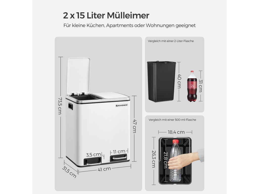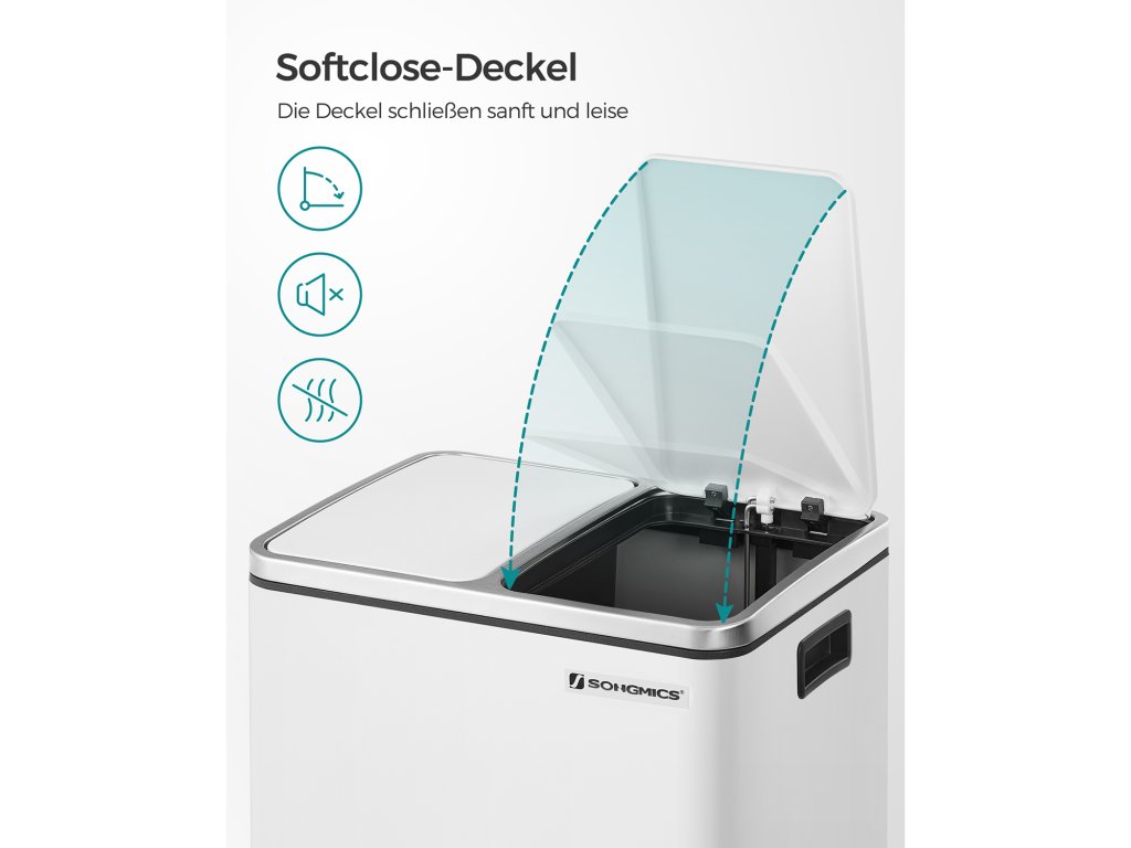 Kuchyňský odpadkový koš, 2 x 15 l ocelový odpadkový koš, stupňovitý koš s vnitřním kbelíkem a držadly, měkký uzávěr, těsnění proti zápachu, bílý.