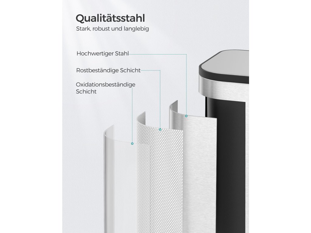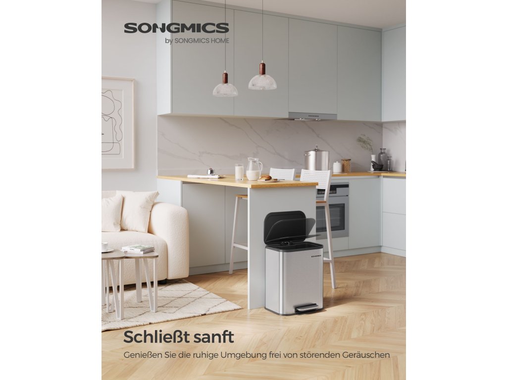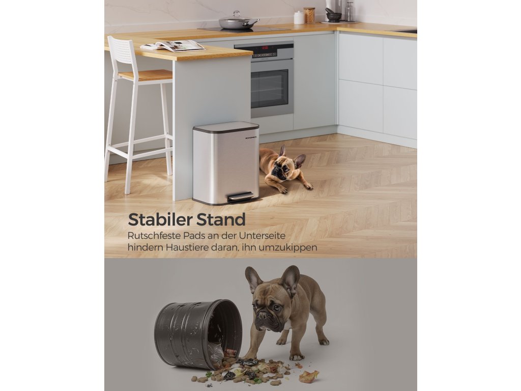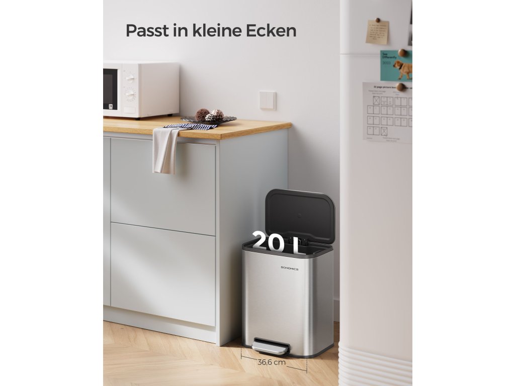 Kompaktní a elegantní Tento 20litrový koš na kuchyňský odpad je díky svému kompaktnímu designu ideální pro malé prostory a je ideální pro jednu nebo dvě osoby. Moderní minimalistický design snadno zapadne do různých stylů interiéru.Odolný a stabilní Tento odpadkový koš je vyroben z odolné oceli, je odolný vůči rzi a nečistotám a snadno se čistí. Protiskluzové podložky na dně zvyšují stabilitu a znesnadňují zvířatům převrhnutí kbelíku.Tiše se zavírá a zůstává otevřené Víko nádoby se zavírá tiše a při otevření se nedotýká stěny, což zabraňuje hlasitému řinčení a bouchání. Když víko otevřete pod úhlem 90°, zůstane otevřené, což je při vaření velmi praktické.Praktická vnitřní nádoba Tato nádoba na pedály má vnitřní nádobu s úchyty pro snadné vyprazdňování. Pokud je pytel na odpadky správně připevněn, není zvenku vidět, což pomáhá udržovat čistý vzhled.Snadné přenášení a pohodlný pedál Praktická rukojeť kontejneru s pedálem usnadňuje přenášení. Široký pedál s protiskluzovým designem zajišťuje snadné otevírání| Kategorie: | Odpadkové koše |
