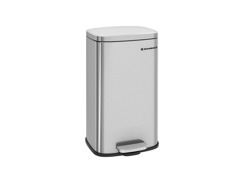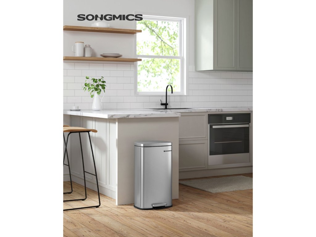 Kuchyňský odpadkový koš, pedálový odpadkový koš 30 l, s plastovým vnitřním vědrem, výklopným víkem, měkkým uzávěrem, hygienický a odolný proti zápachu, stříbrná barva.