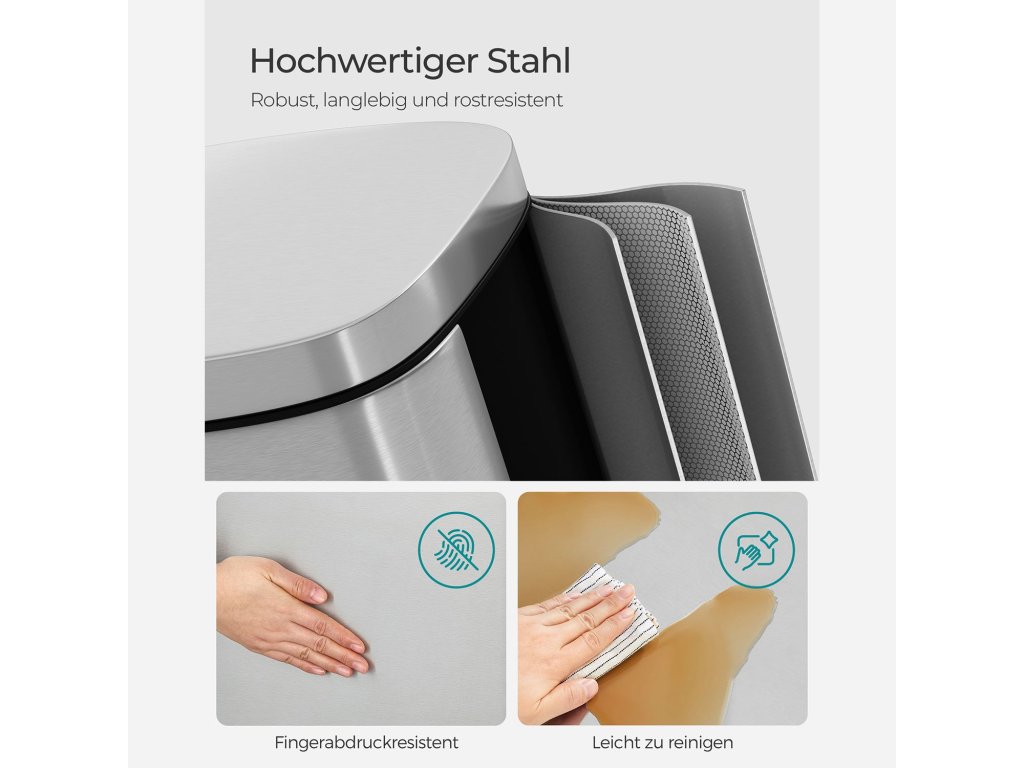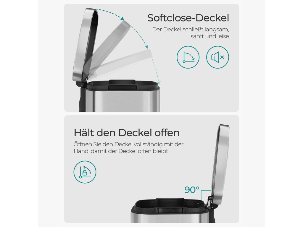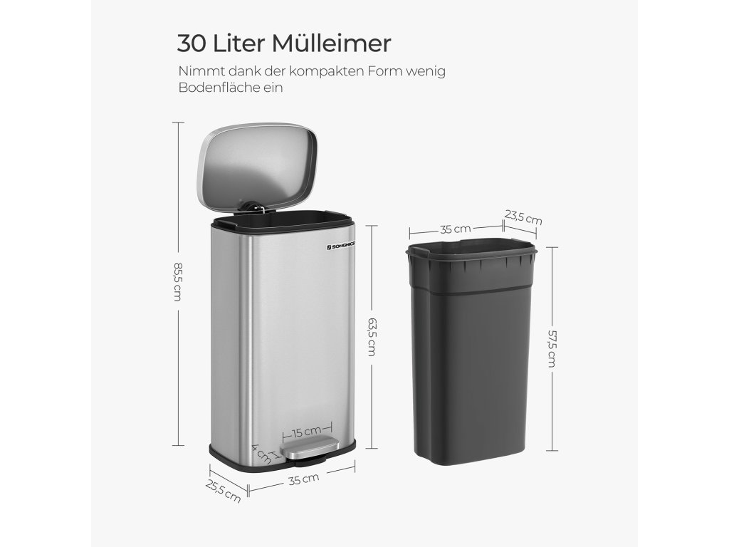 VHODNÝ PRO VĚTŠINU DOMŮ Objem: 30 litrů, Rozměry: 35 x 25,5 x 63,5 cm - Koš poskytuje dostatek místa pro váš odpad, ale nezabírá mnoho místa na podlaze. Je také stylový, moderní a hodí se k různým stylům interiérů.Pouze jednou nohou: k otevření víka koše stačí sešlápnout pedál - máte tak volné ruce k vysypávání odpadků do vnitřního koše.Otevírá se 2 způsoby Jednoduše sešlápněte pedál, abyste otevřeli víko koše a rychle se zbavili odpadu. Víko lze také přidržet tak, že jej zcela otevřete rukou.Vysoce kvalitní ocel Kuchyňský koš z vysoce kvalitní oceli je odolný proti korozi a lze jej snadno čistit vlhkým hadříkem, aby se odstranily nečistoty.Praktické návrhy na zadní straně Vložku do koše lze zajistit na místě zatlačením jejího okraje do zadního otvoru vyjímatelného vnitřního kbelíku. Rukojeť na zadní straně usnadňuje přesouvání pedálového koše.| Kategorie: | Odpadkové koše |
