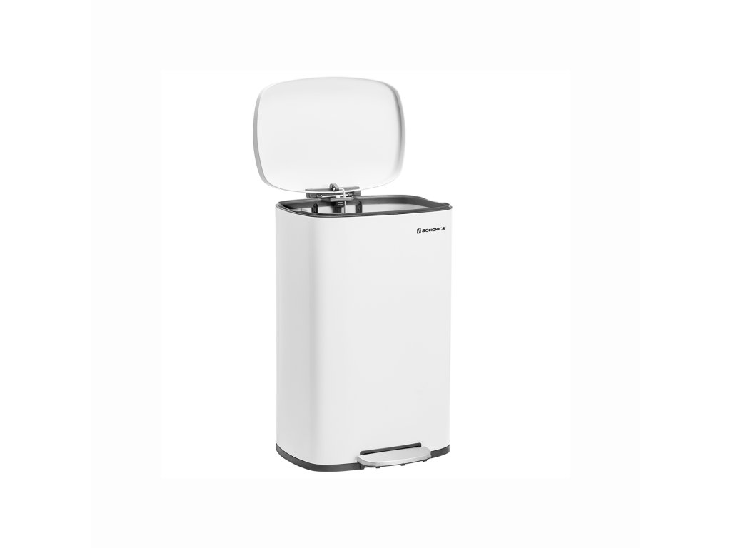 Kuchyňský pedálový odpadkový koš, objem 50 l, s plastovým vnitřním vědrem, výklopným víkem, měkkým uzávěrem, hygienický a odolný proti zápachu, bílý.