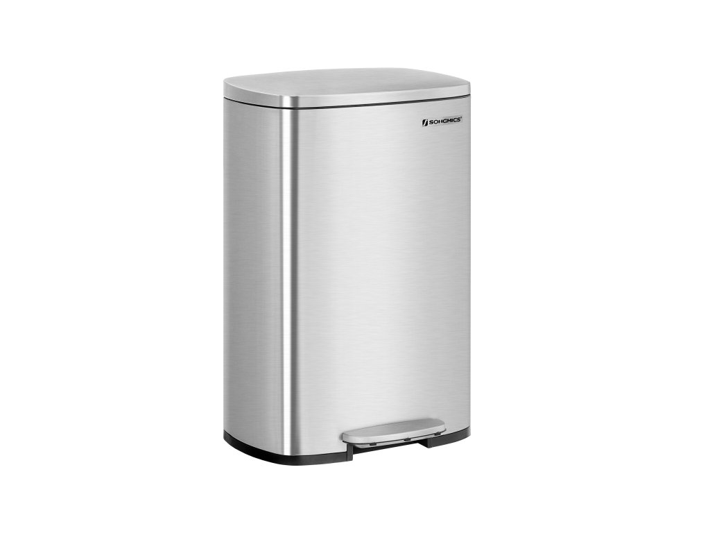 Kuchyňský pedálový odpadkový koš, objem 50 l, s plastovým vnitřním kbelíkem, výklopným víkem, měkkým uzávěrem, odolný proti zápachu a hygienický, stříbrný.