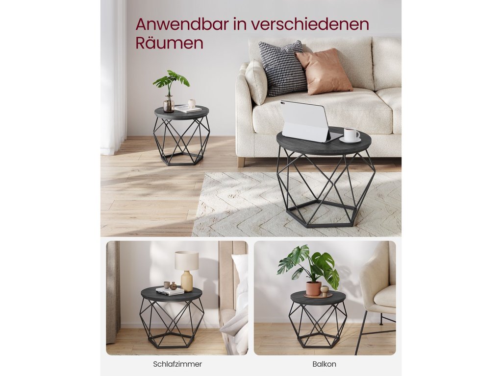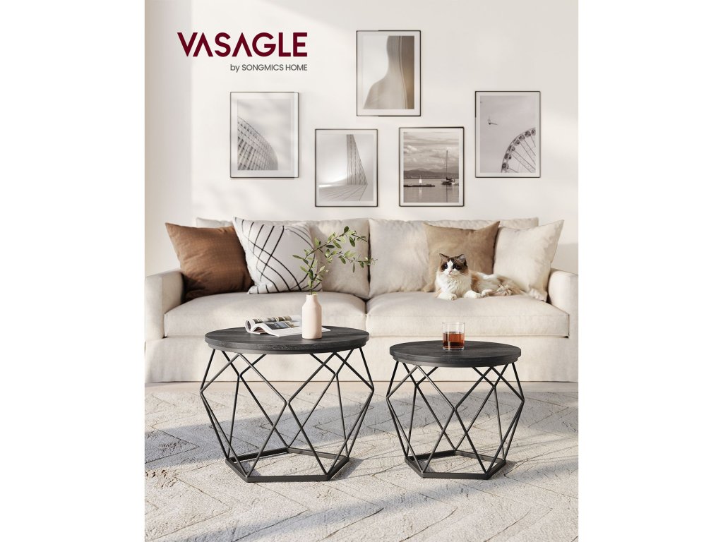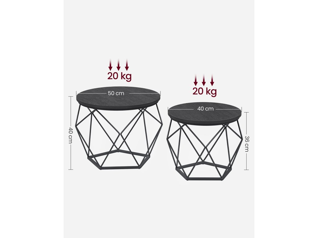 Kompaktní velikost Velký konferenční stolek má rozměry 50 x 40 cm (průměr x výška) a malý konferenční stolek má rozměry 40 x 36 cm (průměr x výška); kompaktní rozměry vhodné do malých prostor umožňují najít to správné místo pro odpolední čaj, dekorace nebo notebook na práci. [Jednoduchá montáž] Díky jasnému návodu a označeným dílům dokončíte montáž této sady 2 postranních stolků dříve, než se nadějete. Nebojte se, pokud ztratíte šroubek, v balení jsou náhradní díly [Stabilní a pevný] Díky kombinaci kvalitní dřevotřískové desky a robustního ocelového rámu je tato sada bočních stolků stabilní, takže se nebude kývat pokaždé, když zvednete šálek kávy. Každý stolek unese až 20 kg [Společně nebo odděleně] Použijte 2 postranní stolky společně pro harmonickou kombinaci v obývacím pokoji pro uložení pokojových rostlin. Nebo je používejte samostatně, jeden vedle pohovky a druhý v ložnici. [Moderní styl] Tyto stolky do obývacího pokoje v moderním stylu vnesou do vašeho prostoru zvláštní nádech díky kulatým černým deskám a geometrickým podstavcům z černé oceli. Jejich atraktivní vzhled zapůsobí na vaše hosty."| Kategorie: | Konferenční stolky |