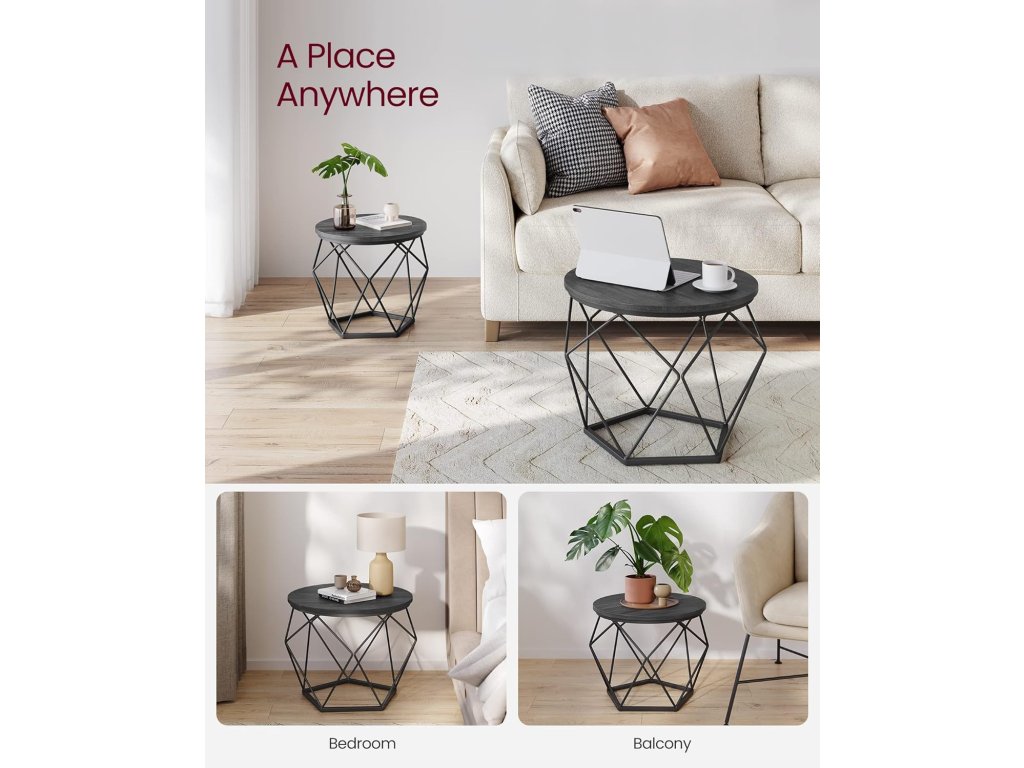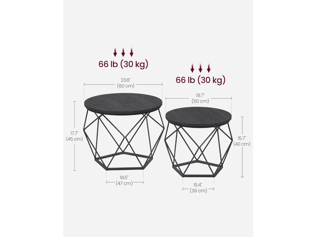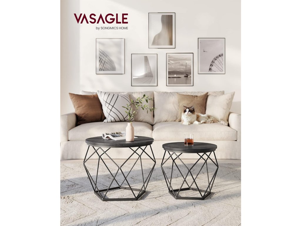 Kompaktní velikost Velký konferenční stolek má rozměry 60 x 45 cm (průměr x výška) a malý konferenční stolek má rozměry 50 x 40 cm (průměr x výška); kompaktní rozměry vhodné do malých prostor umožňují najít to správné místo pro odpolední čaj, dekorace nebo pracovní notebook;Jednoduchá montáž Díky jasnému návodu a označeným dílům sestavíte tuto sadu 2 postranních stolků dříve, než se nadějete. Nebojte se, pokud ztratíte šroubek, v balení jsou náhradní díly.Stabilní a pevný Díky kombinaci kvalitní dřevotřískové desky a robustního ocelového rámu je tato sada stolků stabilní, takže se nebude kývat pokaždé, když zvednete šálek kávy. Každý malý stolek unese až 30 kg.Společně nebo odděleně Použijte 2 boční stolky společně, abyste vytvořili harmonickou kombinaci v obývacím pokoji pro uložení pokojových rostlin. Nebo je použijte samostatně, jeden vedle pohovky a druhý v ložnici.Moderní styl] Tyto konferenční stolky v moderním stylu pro váš obývací pokoj vnesou do vašeho prostoru zvláštní nádech díky kulatým deskám v šedé barvě dřevěného uhlí a geometrickým podstavcům z černé oceli. Jejich atraktivní vzhled udělá na vaše hosty dojem.