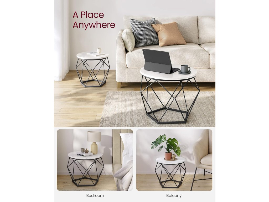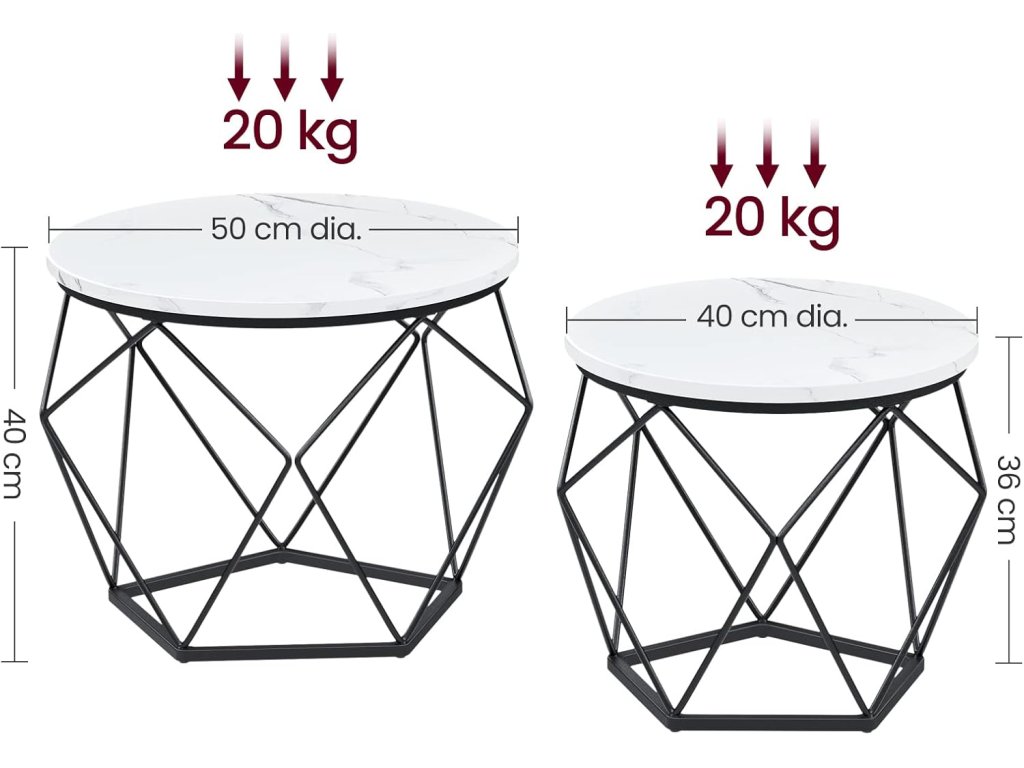 Kompaktní velikost Velký konferenční stolek má rozměry 50 x 40 cm (průměr x výška) a malý konferenční stolek má rozměry 40 x 36 cm (průměr x výška); kompaktní rozměry vhodné do malých prostor umožňují najít to správné místo pro odpolední čaj, dekorace nebo pracovní notebook;Jednoduchá montáž Díky jasnému návodu a označeným dílům sestavíte tuto sadu 2 postranních stolků dříve, než se nadějete. Nebojte se, pokud ztratíte šroubek, v balení jsou náhradní díly.Stabilní a pevný Díky kombinaci kvalitní dřevotřískové desky a robustního ocelového rámu je tato sada stolků stabilní, takže se nebude kývat pokaždé, když zvednete šálek kávy. Každý malý stolek unese až 20 kg.Společně nebo odděleně Použijte 2 boční stolky společně, abyste vytvořili harmonickou kombinaci v obývacím pokoji pro uložení pokojových rostlin. Nebo je použijte samostatně, jeden vedle pohovky a druhý v ložnici.Moderní styl Tyto konferenční stolky v moderním stylu pro váš obývací pokoj vnesou do vašeho prostoru zvláštní nádech díky kulatým bílým deskám a geometrickým podstavcům z černé oceli. Jejich atraktivní vzhled udělá na vaše hosty dojem.| Kategorie: | Konferenční stolky |