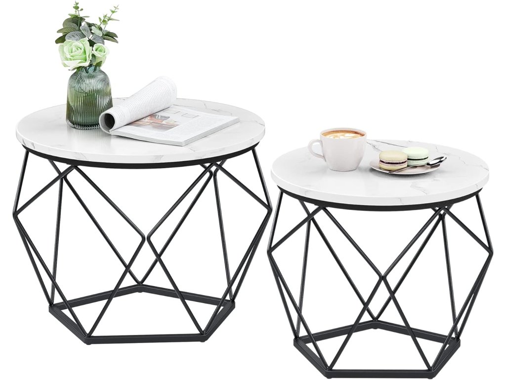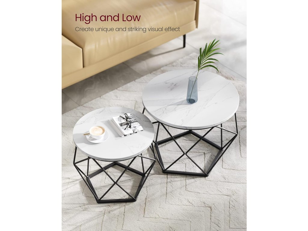 Kulaté konferenční stolky, sada 2 stolků, moderní styl, odnímatelná deska, ocelový rám, do obývacího pokoje, bílá a černá.