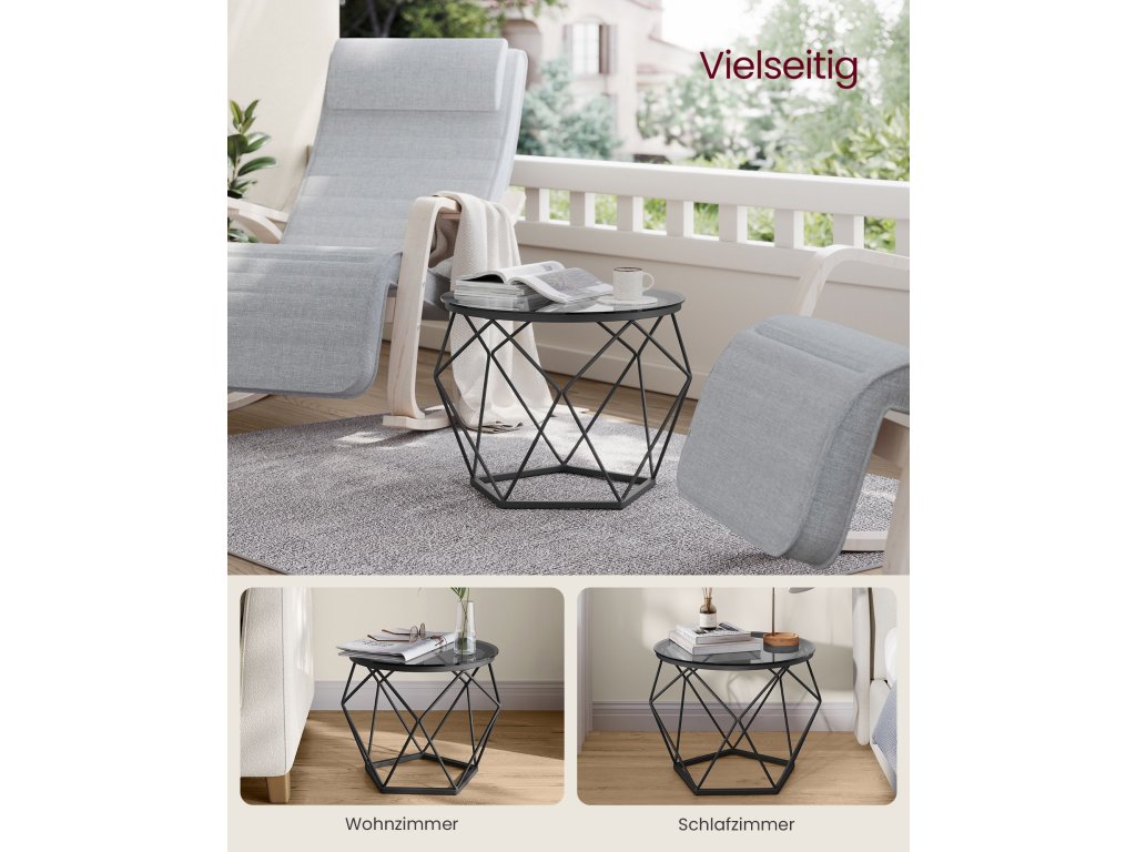Kompaktní velikost Velký konferenční stolek má rozměry 50 x 40 cm (průměr x výška) a malý konferenční stolek má rozměry 40 x 36 cm (průměr x výška); kompaktní rozměry vhodné do malých prostor umožňují najít to správné místo pro odpolední čaj, dekorace nebo pracovní notebook;Jednoduchá montáž Díky jasnému návodu a označeným dílům sestavíte tuto sadu 2 postranních stolků dříve, než se nadějete. Nebojte se, pokud ztratíte šroubek, v balení jsou náhradní díly.Stabilní a pevný Díky kombinaci kvalitního tvrzeného skla a robustního ocelového rámu je tato sada stolků stabilní, takže se nebude kývat pokaždé, když zvednete šálek kávy. Každý malý stolek unese až 20 kg.Společně nebo odděleně Použijte 2 boční stolky společně, abyste vytvořili harmonickou kombinaci v obývacím pokoji pro uložení pokojových rostlin. Nebo je použijte samostatně, jeden vedle pohovky a druhý v ložnici.Moderní styl Tyto konferenční stolky v moderním stylu pro váš obývací pokoj vnesou do vašeho prostoru zvláštní nádech díky kulatým břidlicově šedým deskám a geometrickým podstavcům z černé oceli. Jejich atraktivní vzhled udělá na vaše hosty dojem.| Kategorie: | Konferenční stolky |