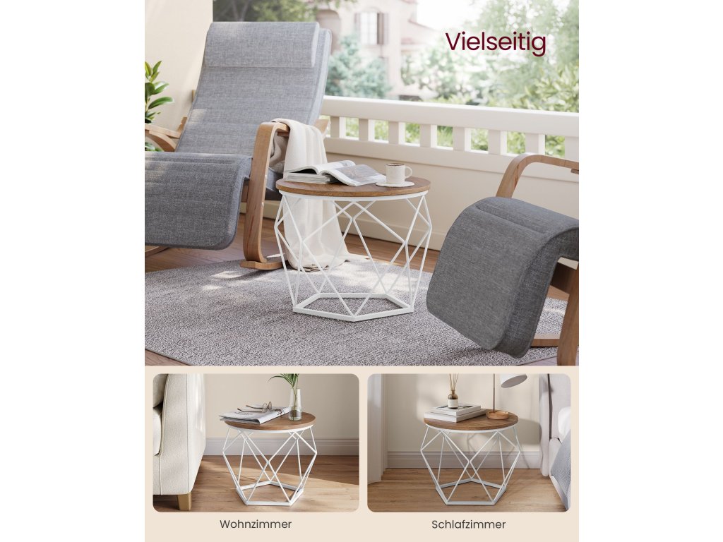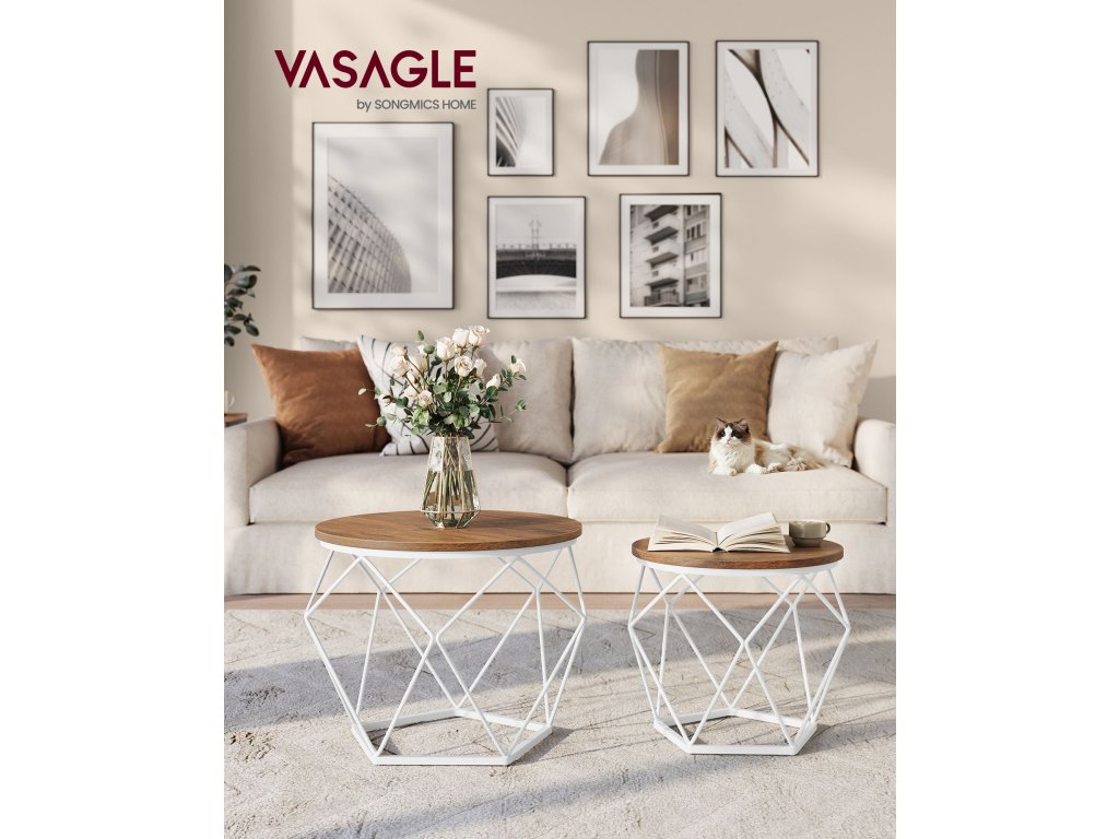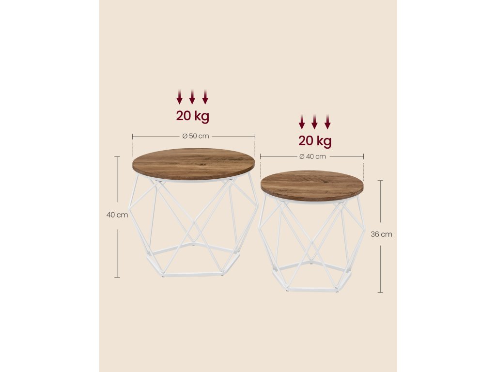 Kompaktní velikost Velký konferenční stolek má rozměry 50 x 40 cm (průměr x výška) a malý konferenční stolek má rozměry 40 x 36 cm (průměr x výška); kompaktní rozměry vhodné do malých prostor umožňují najít to správné místo pro odpolední čaj, dekorace nebo pracovní notebook;Jednoduchá montáž Díky jasnému návodu a označeným dílům sestavíte tuto sadu 2 postranních stolků dříve, než se nadějete. Nebojte se, pokud ztratíte šroubek, v balení jsou náhradní díly.Stabilní a pevný Díky kombinaci kvalitní dřevotřískové desky a robustního ocelového rámu je tato sada stolků stabilní, takže se nebude kývat pokaždé, když zvednete šálek kávy. Každý malý stolek unese až 20 kg.Společně nebo odděleně Použijte 2 boční stolky společně, abyste vytvořili harmonickou kombinaci v obývacím pokoji pro uložení pokojových rostlin. Nebo je použijte samostatně, jeden vedle pohovky a druhý v ložnici.Moderní styl Tyto konferenční stolky v moderním stylu pro váš obývací pokoj vnesou do vašeho prostoru zvláštní nádech díky kulatým medově hnědým deskám a geometrickým podstavcům z bílé oceli. Jejich atraktivní vzhled udělá na vaše hosty dojem.| Kategorie: | Konferenční stolky |