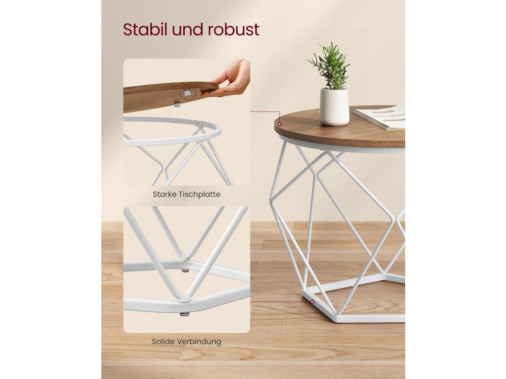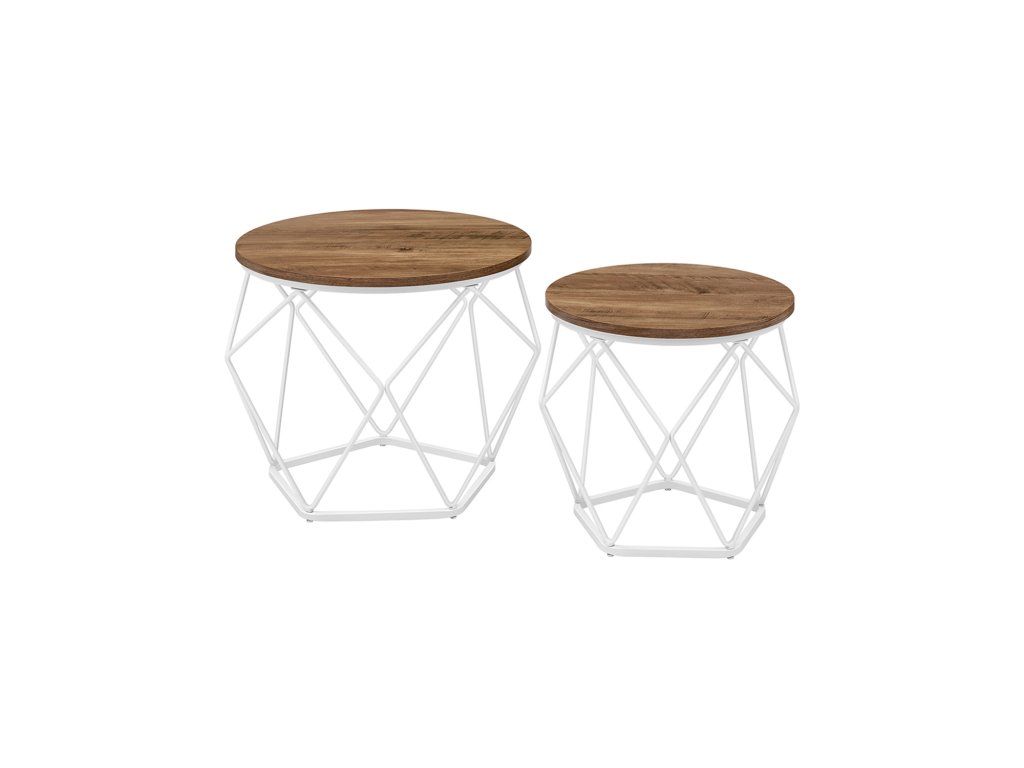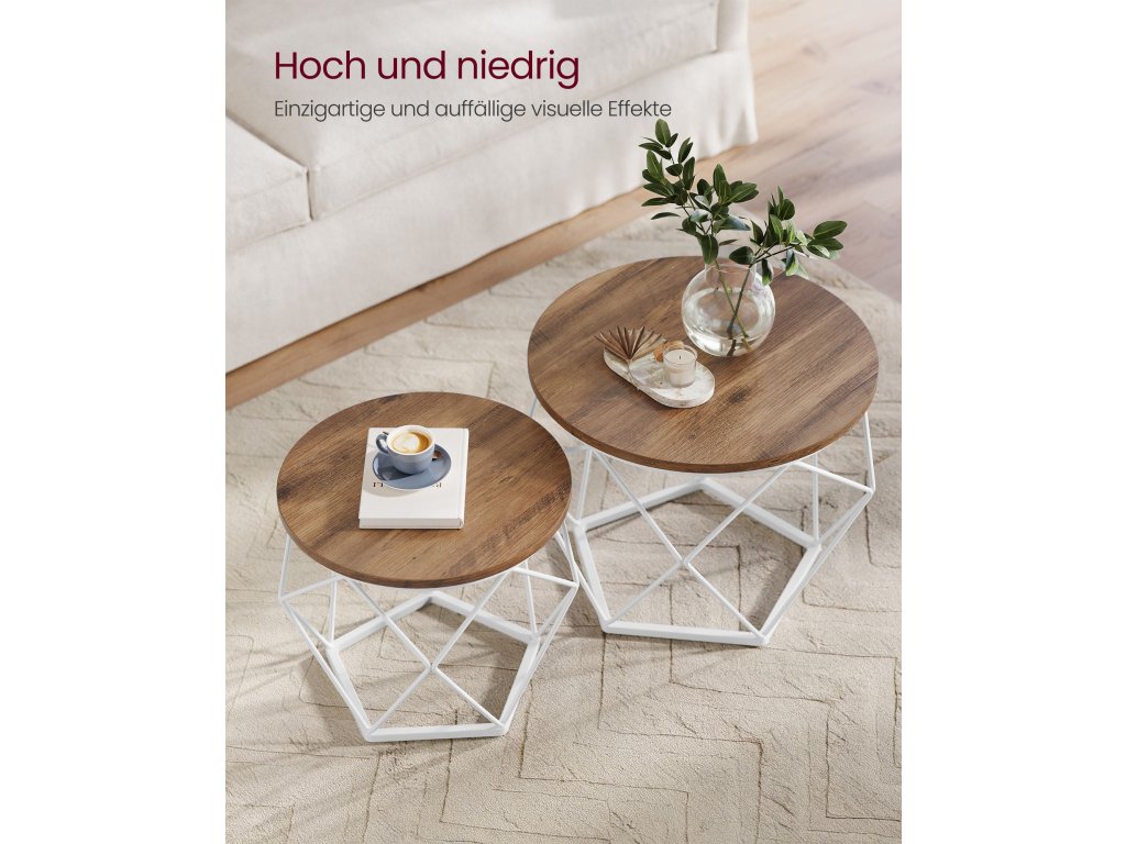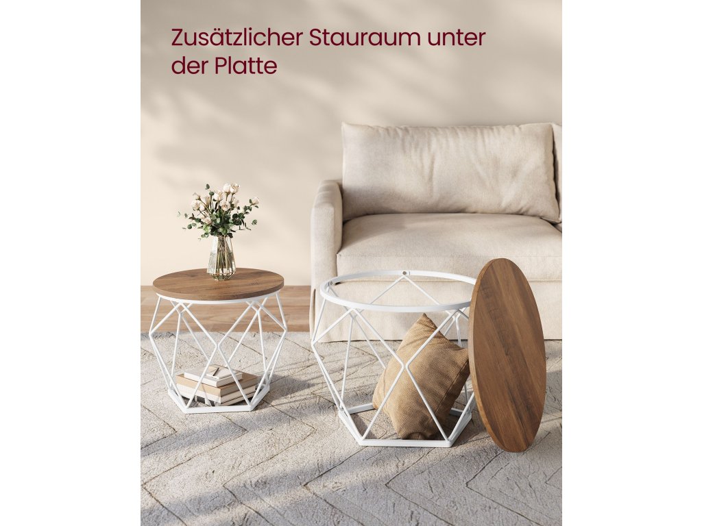 Kulaté konferenční stolky, sada 2 stolků, moderní styl, odnímatelná deska, ocelový rám, do obývacího pokoje, medově hnědá a bílá.