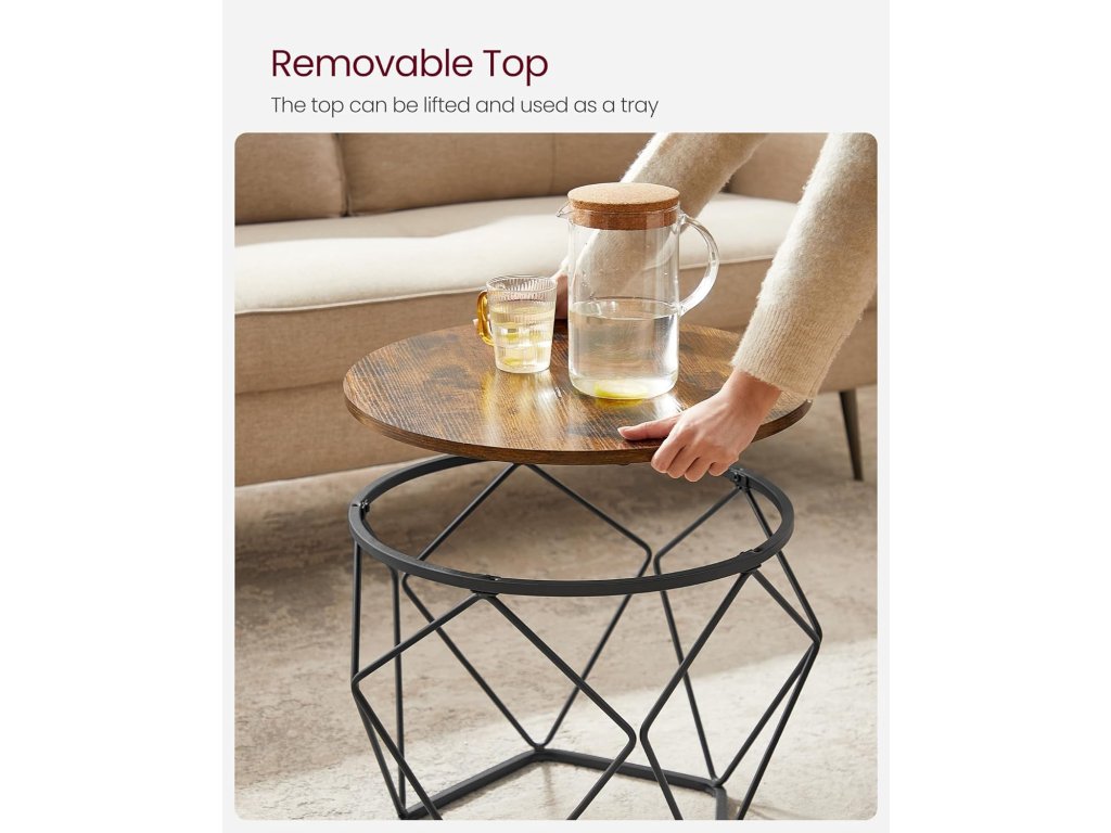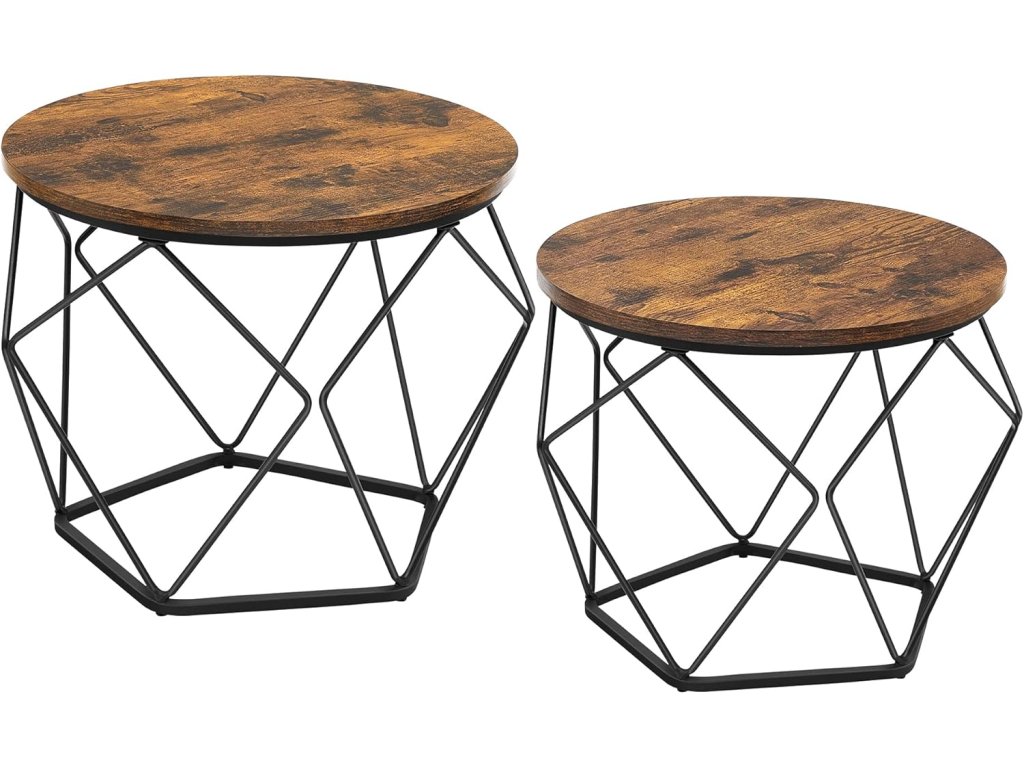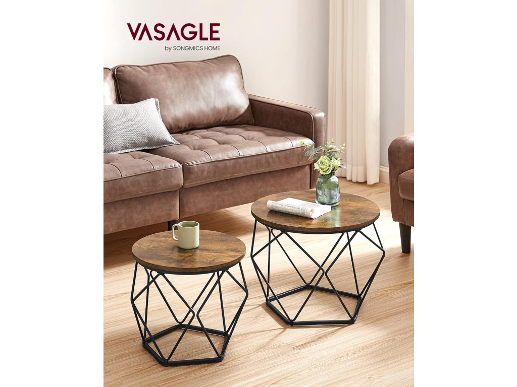 Kulaté konferenční stolky, sada 2 stolků, moderní styl, odnímatelná deska, ocelový rám, do obývacího pokoje, rustikální hnědá a inkoustově černá.