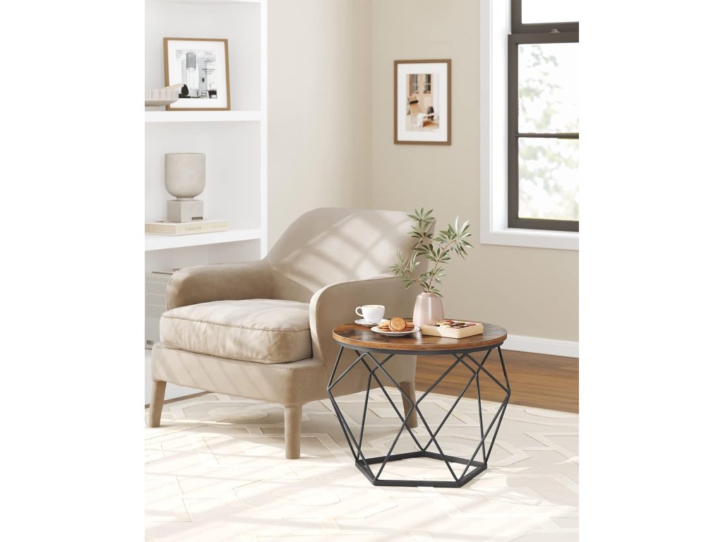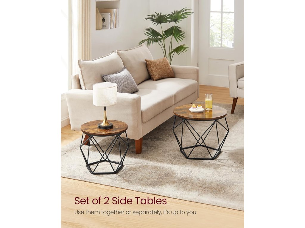 Kompaktní velikost Velký konferenční stolek má rozměry 60 x 45 cm (průměr x výška) a malý konferenční stolek má rozměry 50 x 40 cm (průměr x výška); kompaktní rozměry vhodné do malých prostor umožňují najít to správné místo pro odpolední čaj, dekorace nebo pracovní notebook;Jednoduchá montáž Díky jasnému návodu a označeným dílům sestavíte tuto sadu 2 postranních stolků dříve, než se nadějete. Nebojte se, pokud ztratíte šroubek, v balení jsou náhradní díly.Stabilní a pevný Díky kombinaci kvalitní dřevotřískové desky a robustního ocelového rámu je tato sada stolků stabilní, takže se nebude kývat pokaždé, když zvednete šálek kávy. Každý malý stolek unese až 30 kg.Společně nebo odděleně Použijte 2 boční stolky společně, abyste vytvořili harmonickou kombinaci v obývacím pokoji pro uložení pokojových rostlin. Nebo je použijte samostatně, jeden vedle pohovky a druhý v ložnici.Moderní styl Tyto konferenční stolky v moderním stylu pro váš obývací pokoj vnesou do vašeho prostoru zvláštní nádech díky kulatým rustikálním hnědým deskám a geometrickým černým ocelovým podstavám. Jejich atraktivní vzhled udělá na vaše hosty dojem.| Kategorie: | Konferenční stolky |