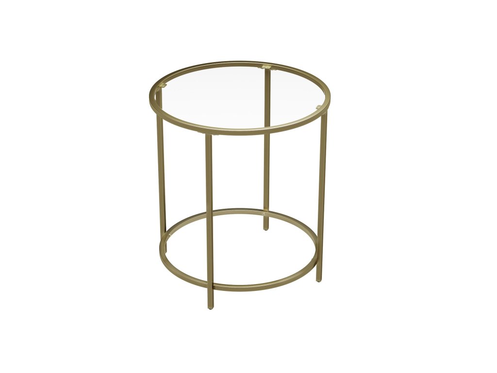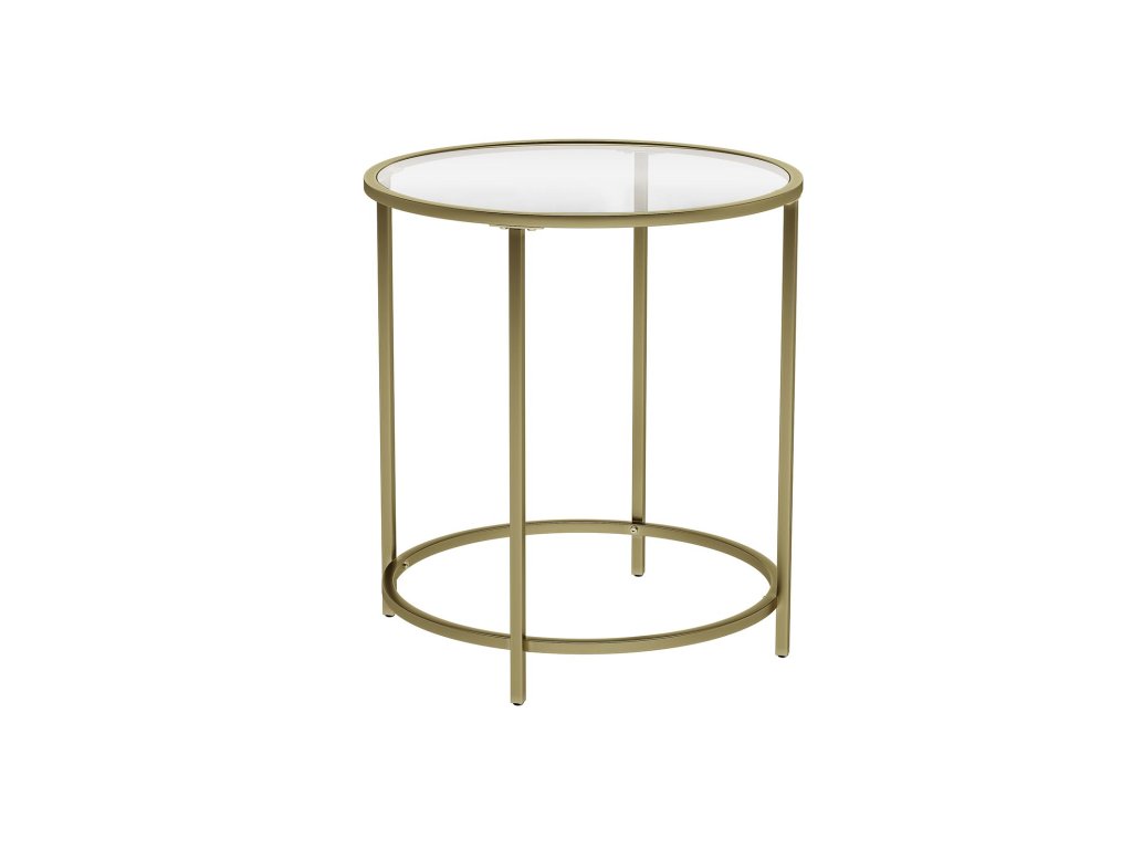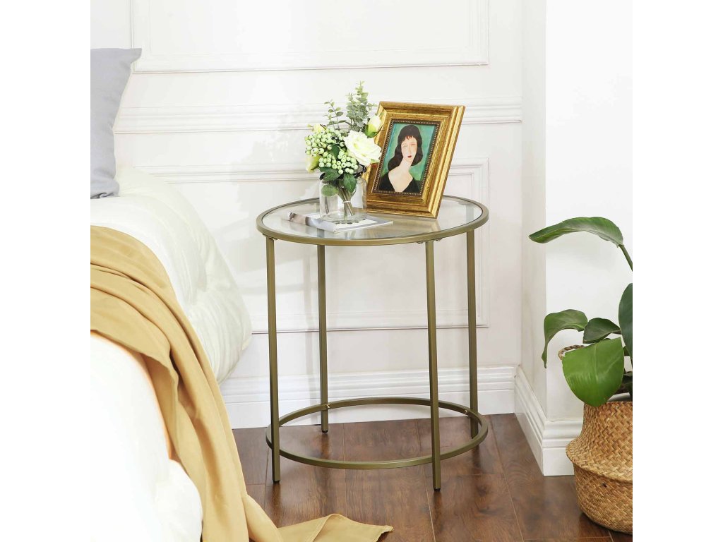 Kulatý odkládací stolek, koncovka z tvrzeného skla se zlatým kovovým rámem, malý konferenční stolek, noční stolek, obývací pokoj, balkon, robustní a stabilní, dekorativní, zlatý.