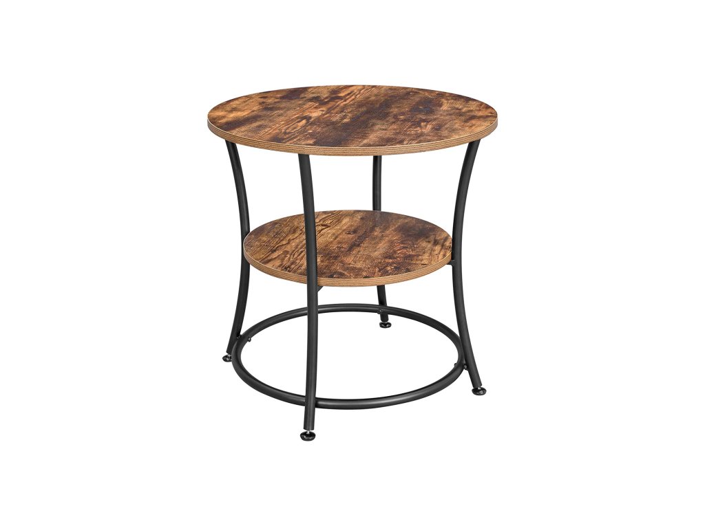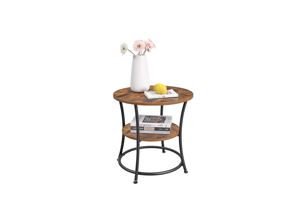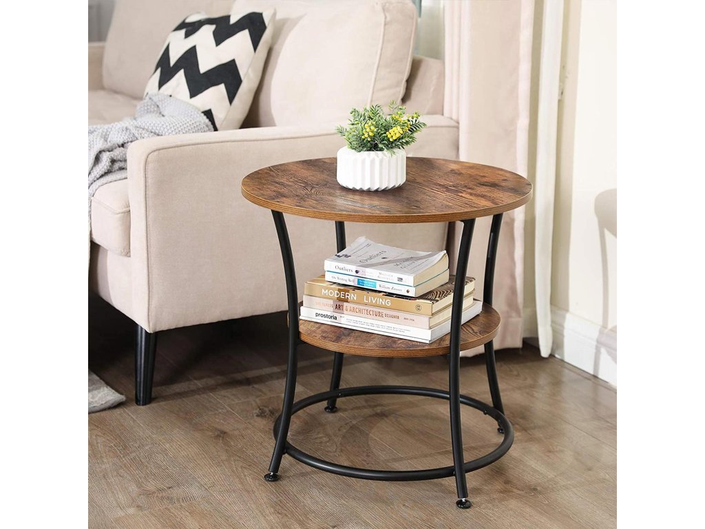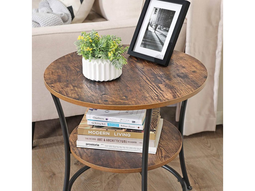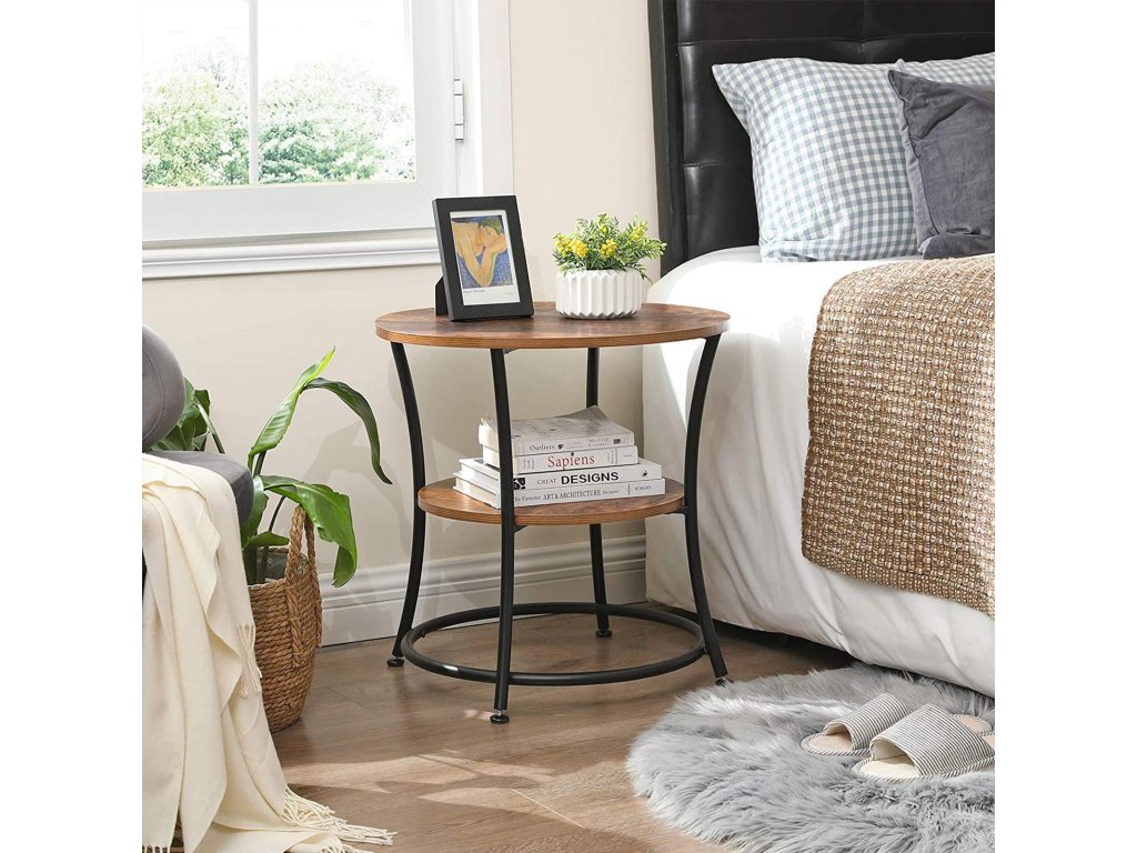 Kulatý odkládací stolek, koncový stolek se 2 policemi, obývací pokoj, ložnice, snadná montáž, kov, průmyslový design, rustikální hnědá.
