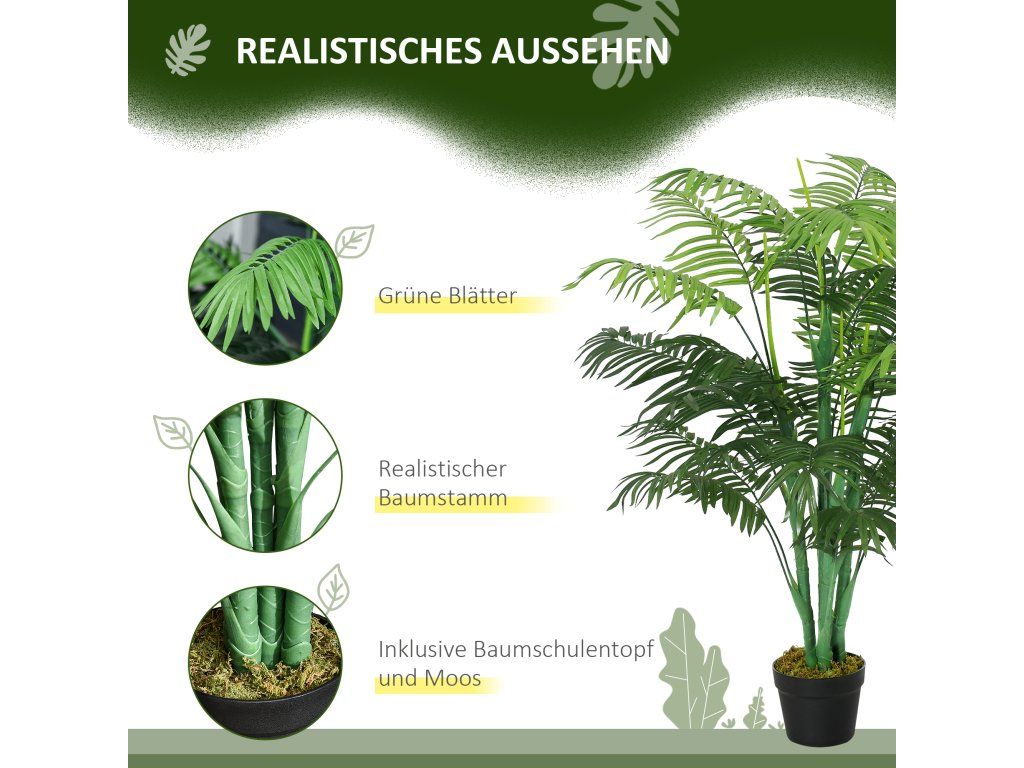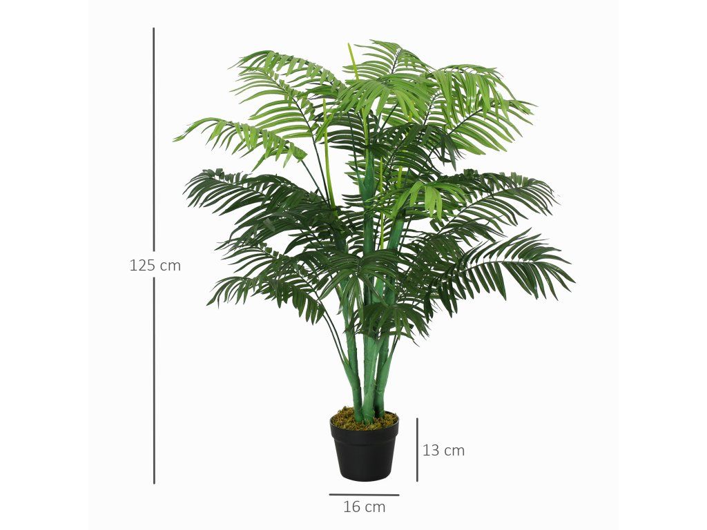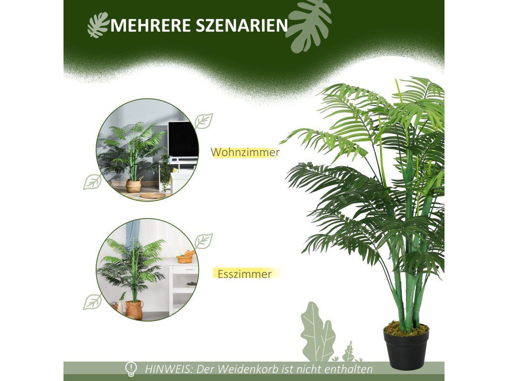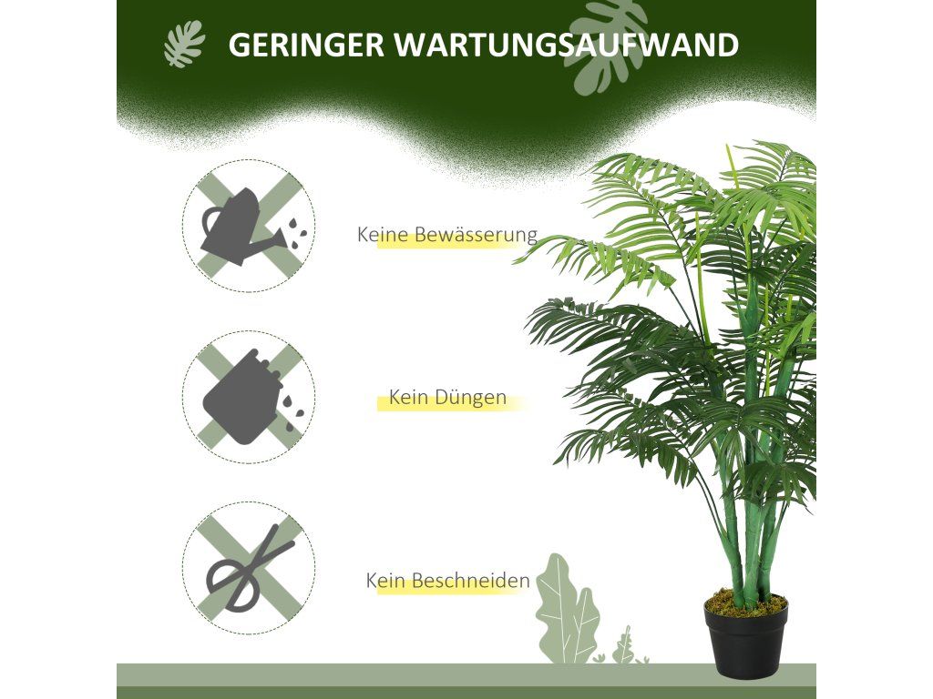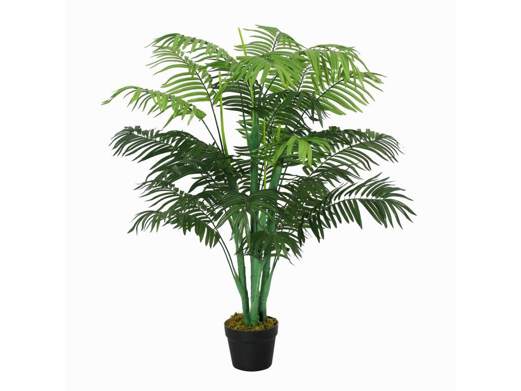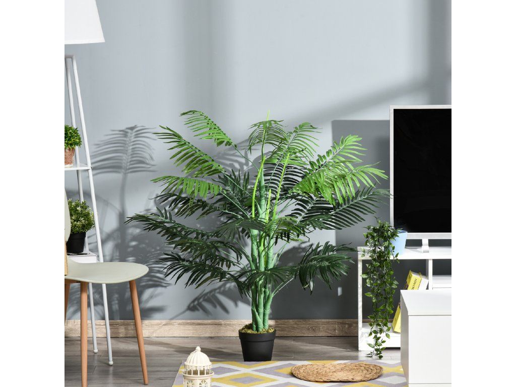 Chcete zelené rostliny bez starostí? Naše umělá palma vydrží zelená po mnoho let – není potřeba žádný prořezávání ani zalévání. Žádné hnojivo, žádné starosti na cestách! Realistické listy této pokojové rostliny vytvářejí útulnou atmosféru a její nenáročnost na údržbu ji předurčuje do interiéru. Dodává se v květináči, doplní jakoukoli výzdobu a je ihned připravena k použití.